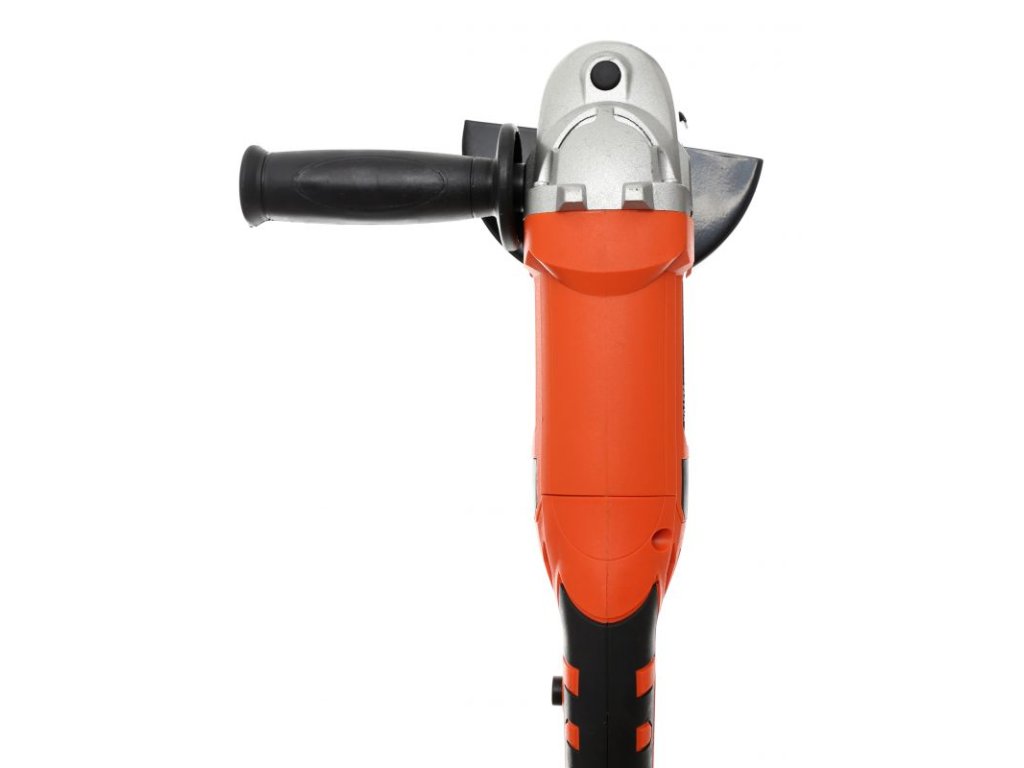 - Hlavní rukojeť je vyrobena ze speciálního protiskluzového materiálu, který zajišťuje snadné držení zařízení v ruce. Kryt převodovky je vyroben z hliníkové slitiny a výbava zahrnuje také přídavnou rukojeť a kryt kotouče