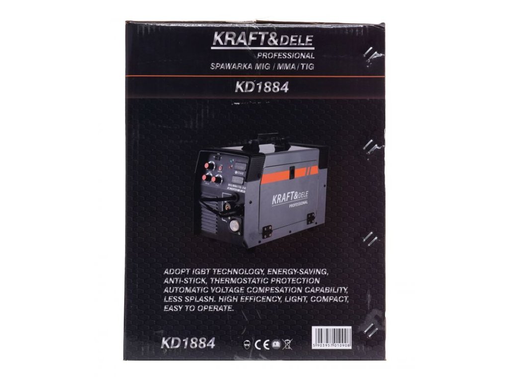 Svářečka Kraft&Dele KD1884 je univerzální zařízení vhodné pro svařování nerezové, slitinové a uhlíkové oceli, mědi a neželezných kovů. Tato svářečka je ideální pro domácí i profesionální použití. Vyniká optimálním výkonem s ocelovým drátem o průměru 0,8 mm, ale lze použít také plný nebo jádrový drát o průměru 0,6 mm, 0,9 mm nebo 1,0 mm. Svářečka využívá tranzistory IGBT, které kombinují snadné ovládání a vysoké napětí s rychlým přepínáním.