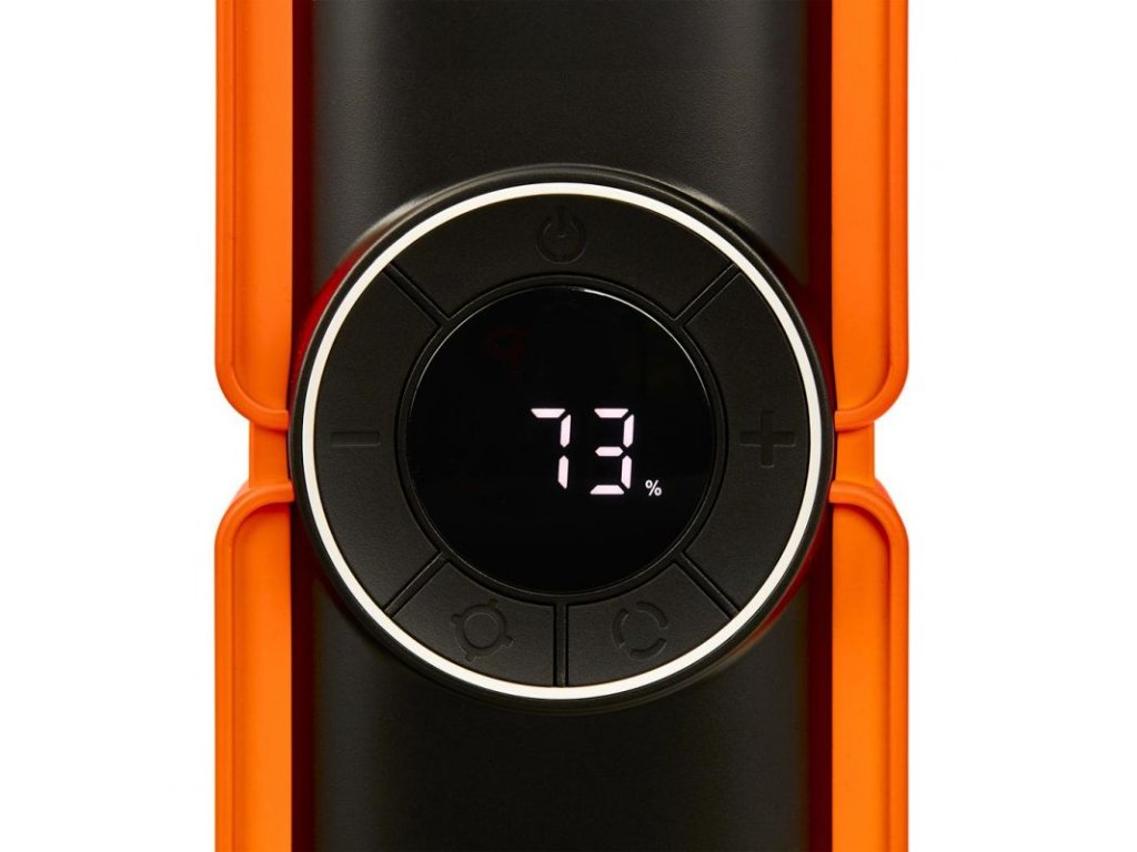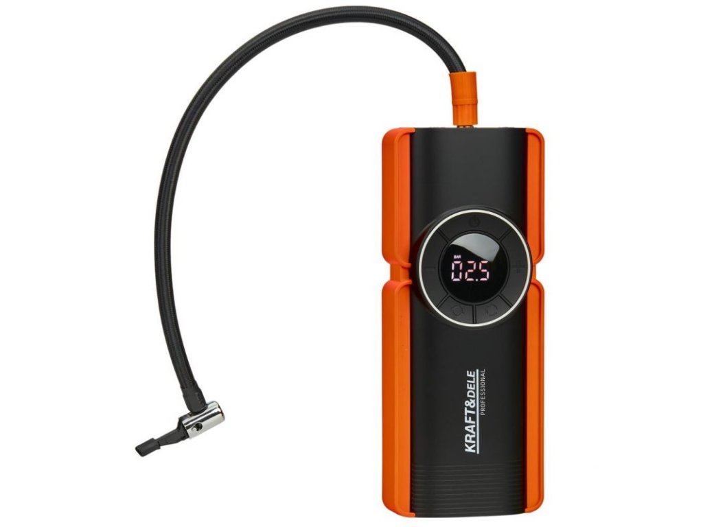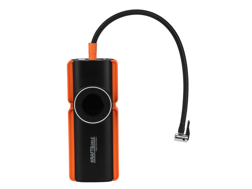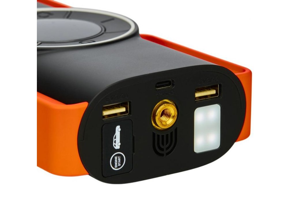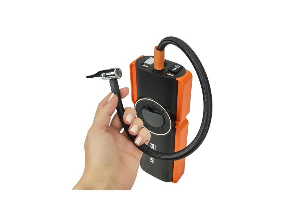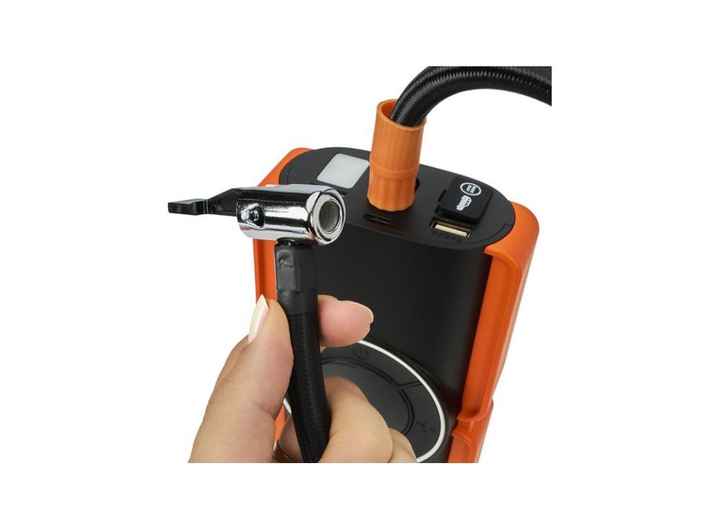 Integrovaný kompresor s průtokem 25 l/min umožňuje pohodlné huštění pneumatik s automatickým zastavením po dosažení nastaveného tlaku. Vestavěná LED svítilna (1 W) usnadní práci ve tmě a port USB slouží k napájení telefonů a drobné elektroniky. Nabíjení probíhá přes USB-C (5 V / 3 A), do plného nabití přibližně za 5 hodin.