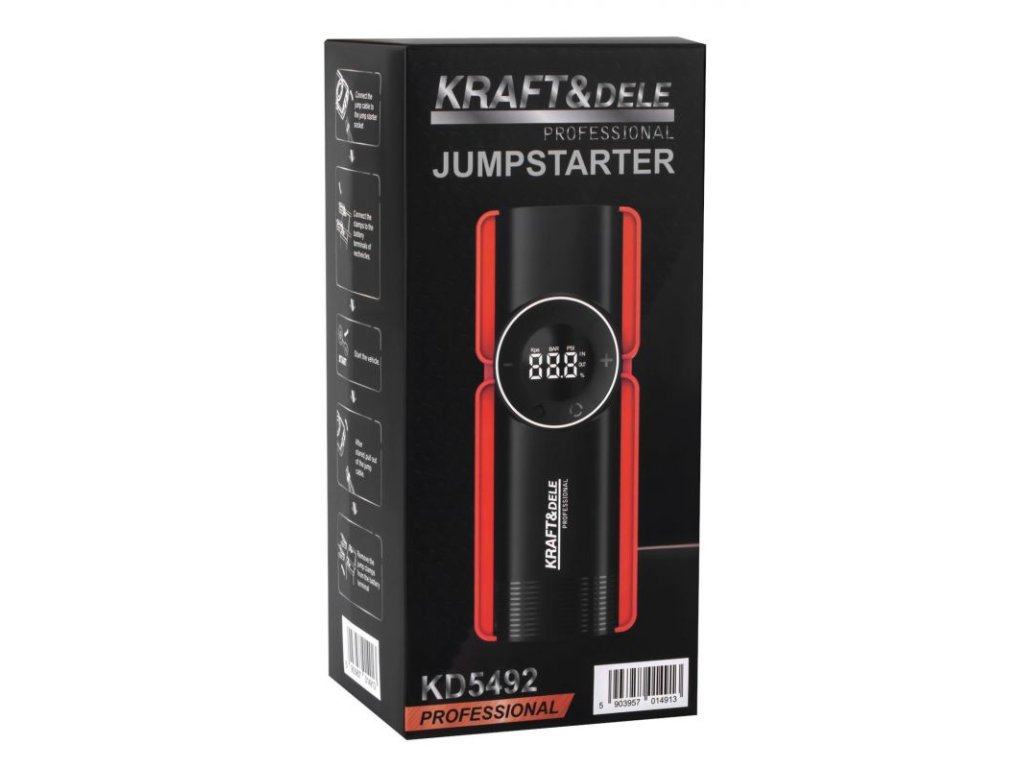 KD5492 je kompaktní víceúčelové zařízení spojující nouzový startér 12 V, powerbank, kompresor vzduchu a LED svítilnu. Spolehlivě podporuje start benzínových motorů až do 9,0 l a dieselů do 7,0 l; LED displej přehledně zobrazí stav nabití i aktivní výstupy. Vysoký špičkový proud 1200 A a baterie 10 000 mAh z něj dělají praktického pomocníka na cesty, do dílny i pro každodenní použití.
