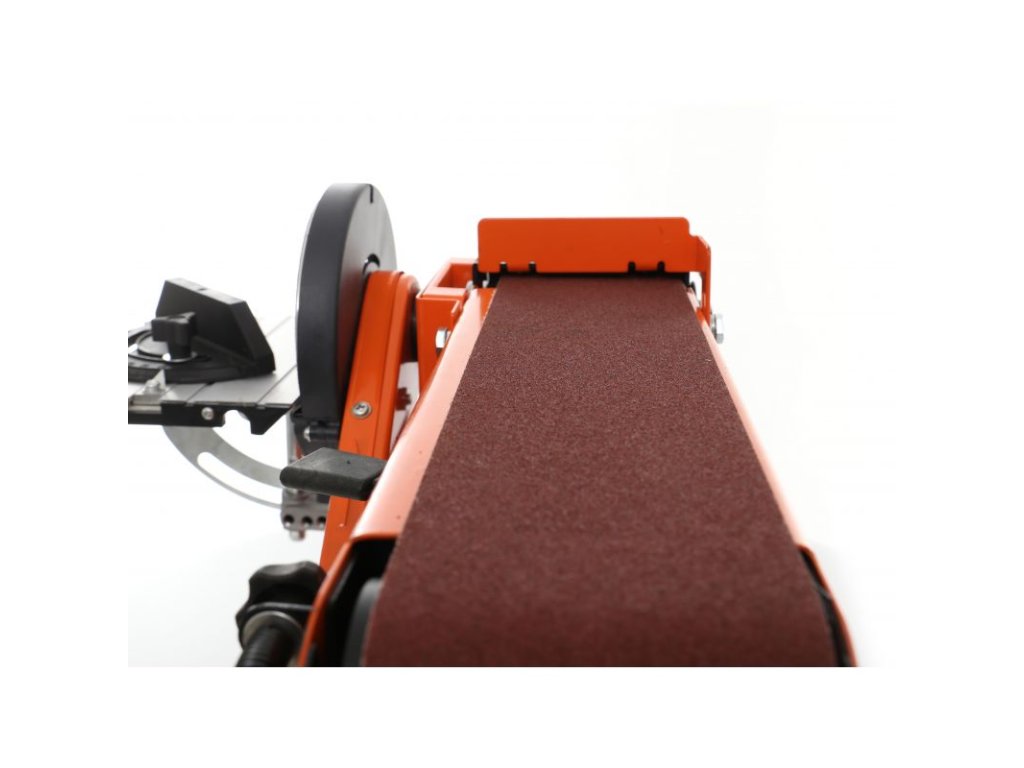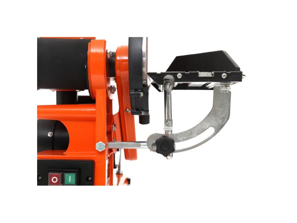 Modul kotoučové brusky má sklápěcí desku umožňující práci kolmo k disku (v rozsahu 0-45 stupňů), zatímco stolní pás má možnost práce jak vodorovně, tak i svisle (v rozsahu 0-90 stupňů).