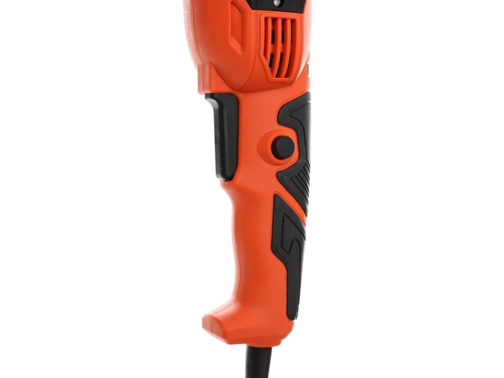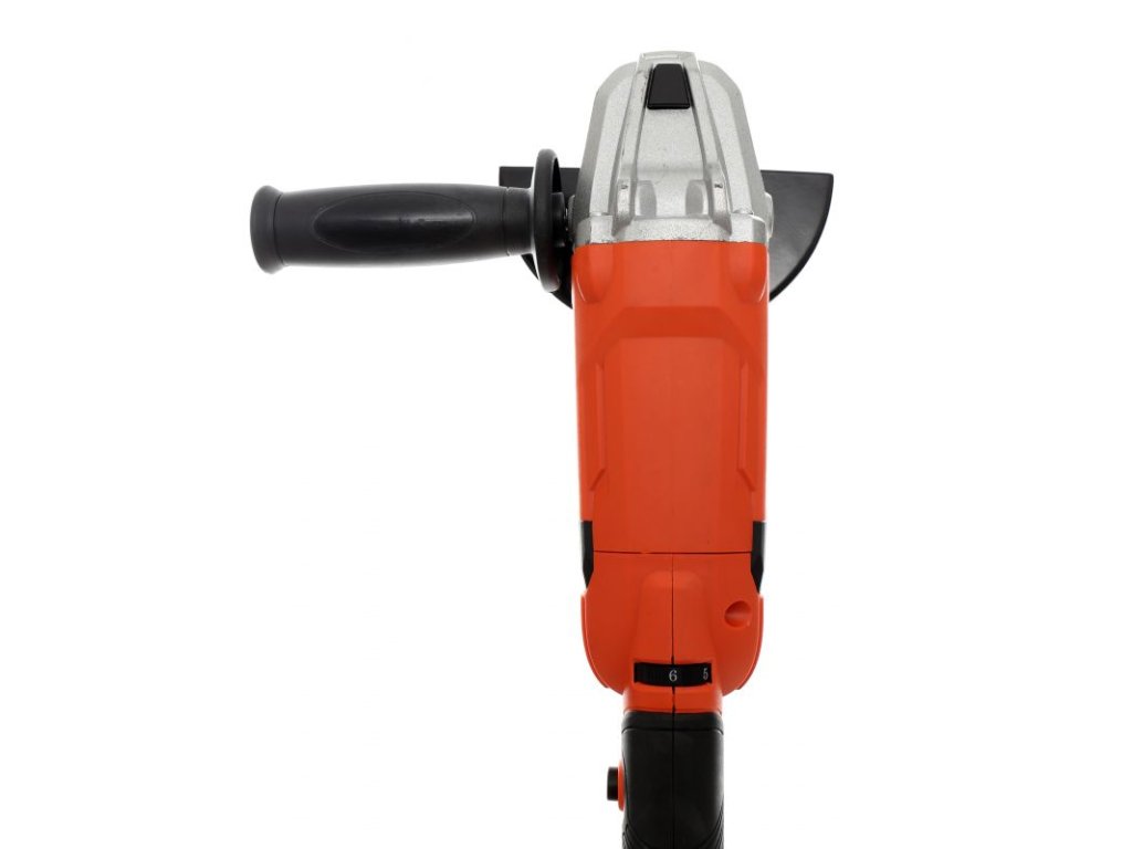 - Hlavní rukojeť je vyrobena ze speciálního protiskluzového materiálu, který zajišťuje snadné držení zařízení v ruce. Kryt převodovky je vyroben z hliníkové slitiny a výbava zahrnuje také přídavnou rukojeť a kryt kotouče