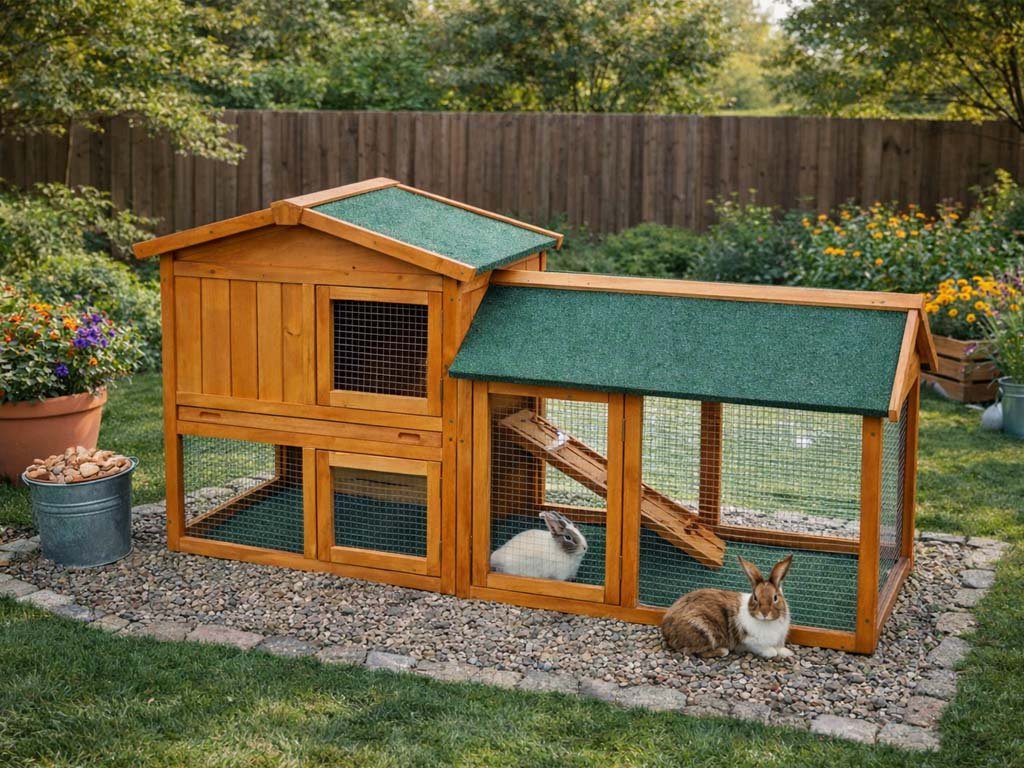 Benji králíkárna z jedlového dřeva. Vhodné pro 4–6 malých zvířat. Střecha: dřevo (sedlová). Rozměry: 146 cm × 54 cm × 86 cm. Vhodné pro 4–6 malých zvířat. Vysouvací pozinkovaný podnos pro snadné čištění. Vodotěsná asfaltová střecha, odolná proti dešti a UV záření. Vysoce kvalitní dřevěná konstrukce. Snadná montáž.