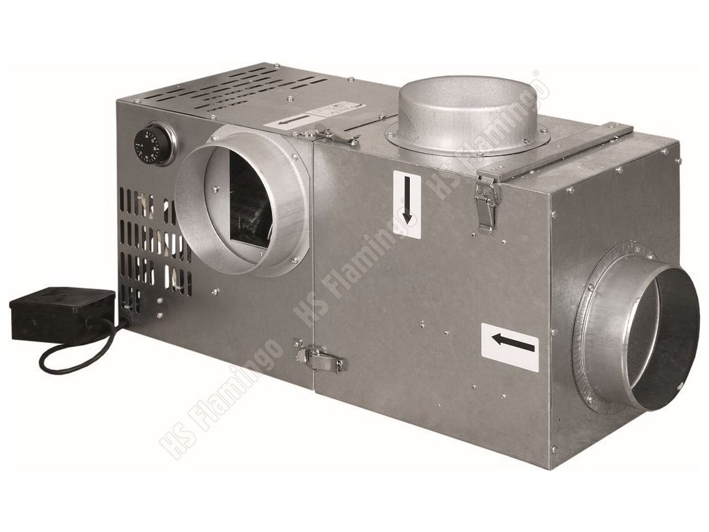 Ventilátor s termostatem určený k nucenému oběhu horkého vzduchu. Termostat se zapíná, když teplota vzduchu proudícího zařízením dosáhne požadované hodnoty, a vypíná se, když teplota požadované hodnoty nedosahuje. Ventilátor může pracovat rovněž v nepřetržitém provozu. Systém potrubí s obdélníkovým nebo kulatým průřezem umožňuje rozvod horkého vzduchu na větší vzdálenost. Vytvořený tlak zajišťuje rozvod horkého vzduchu do několika místností současně. Ventilátor je konstruována pro nepřetržitou práci při teplotách od +20 do +150°C. Ventilátor lze připojit k automatickému regulátoru otáček.