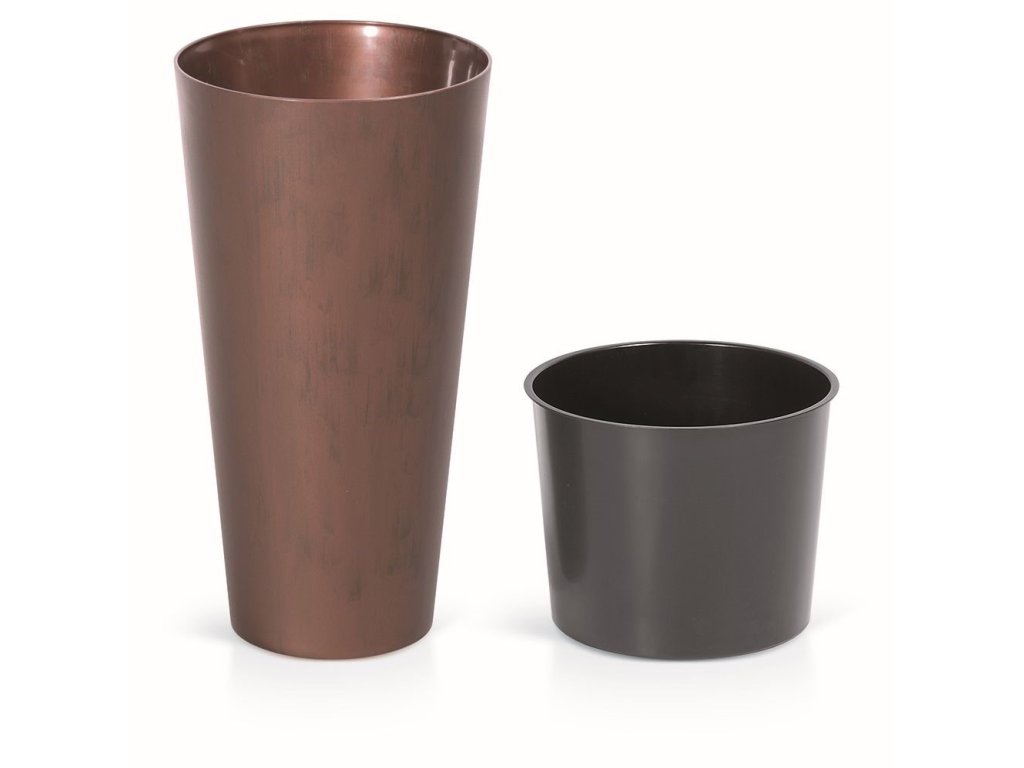 Vysoký květináč, objem 27 l, design v podobě patinující oceli, vhodný do exteriéru i interiéru, v balení praktická vložka pro sázení rostlin, rozměry 30 x 57,2 x 30 cm, bronzová barva.