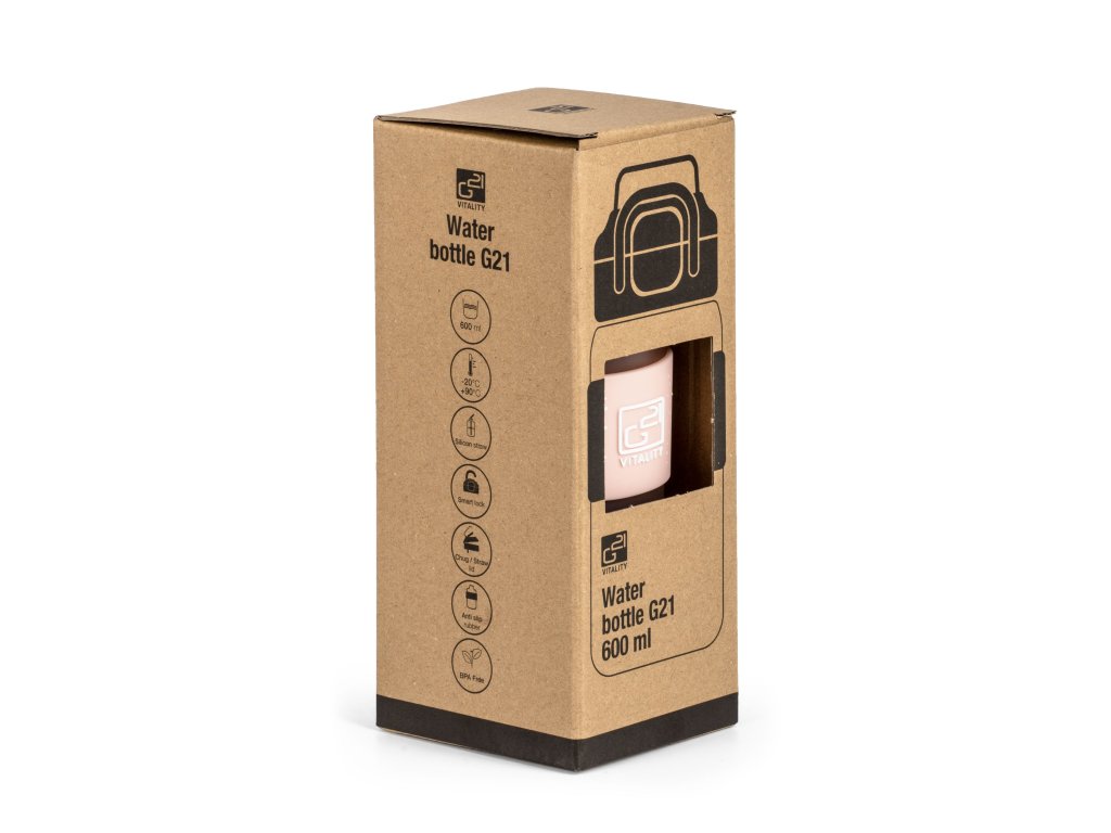 Láhve G21 jsou navrženy s důrazem na funkčnost a pohodlí pro každý den. Díky inovativnímu řešení víčka si můžete vybrat způsob pití přesně tak, jak vám to vyhovuje. Buď brčkem, nebo přímo z hrdla. Díky pevné pojistce víka máte stoprocentní jistotu, že pitná láhev nebude protékat. Silikonový kroužek po obvodu neplní jen designovou funkci, ale zároveň zabraňuje klouzání přenosné láhve v ruce. Nechybí ani vyšívané poutko, které zajišťuje snadné a pohodlné přenášení lahve a podtrhuje její výjimečnost.