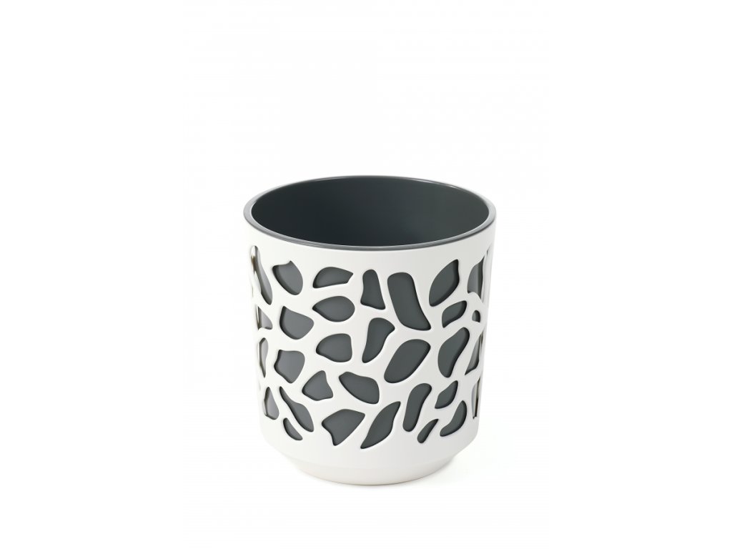 Moderní plastový květináč DUET se skládá ze dvou kusů, děrovaný květináč - obal a plný květináč - vklad. Květináč (vklad) má tmavě šedou barvu, obal (děrovaný květináč) je ve světle krémové barvě (krémovo/bílá).