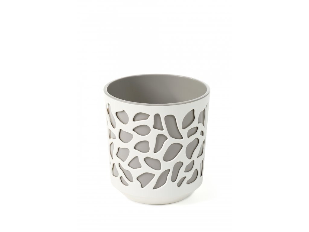 Moderní plastový květináč DUET se skládá ze dvou kusů, děrovaný květináč - obal a plný květináč - vklad. Květináč (vklad) má tmavě šedou barvu, obal (děrovaný květináč) je ve světle krémové barvě (krémovo/bílá).