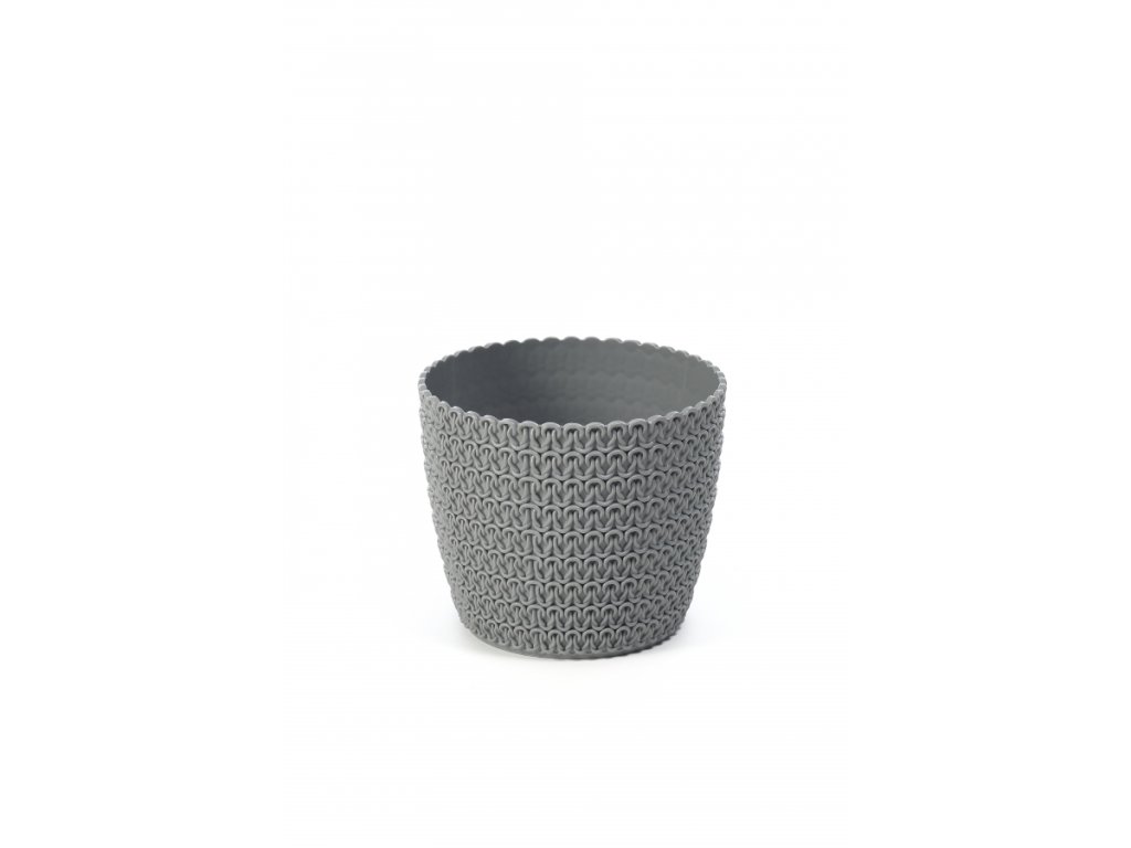 Moderní plastový květináč MAGNOLIA JERSEY v šedé barvě je z vnější strany zdobený pleteným dekorem.