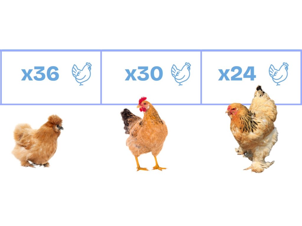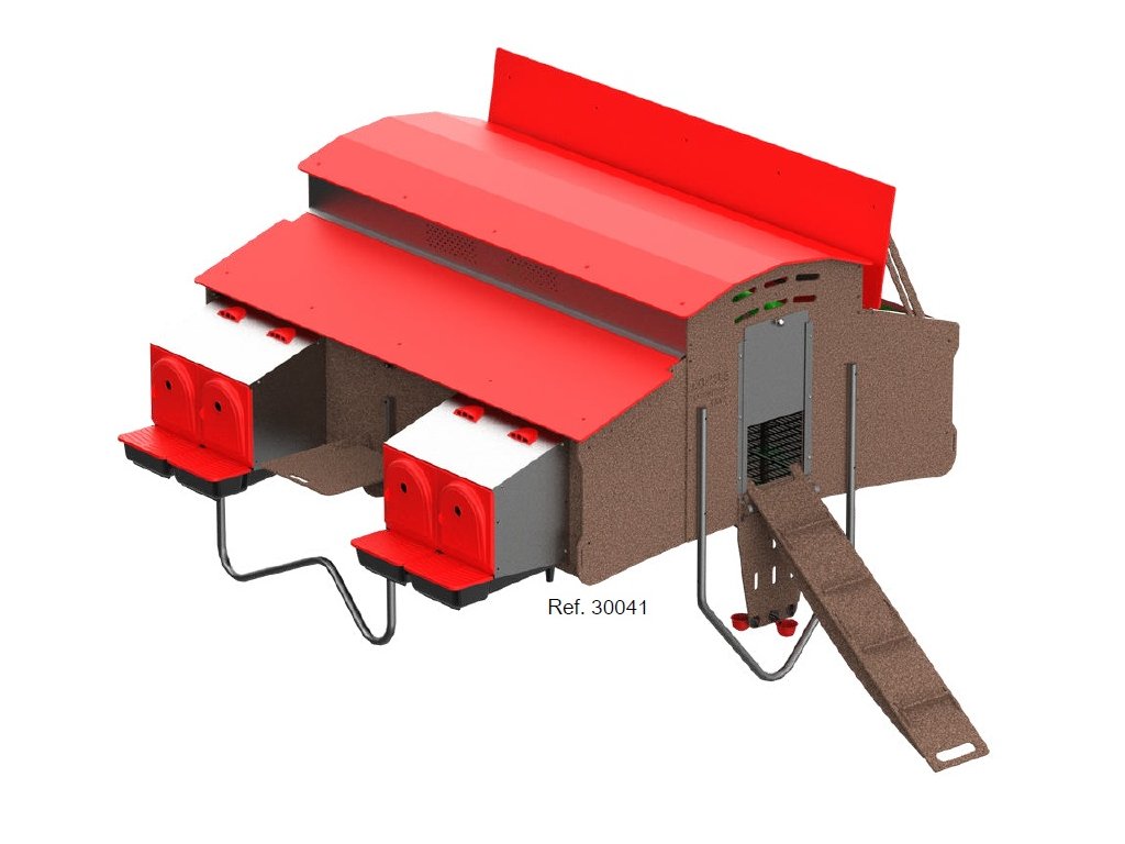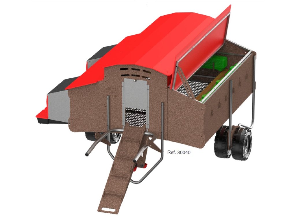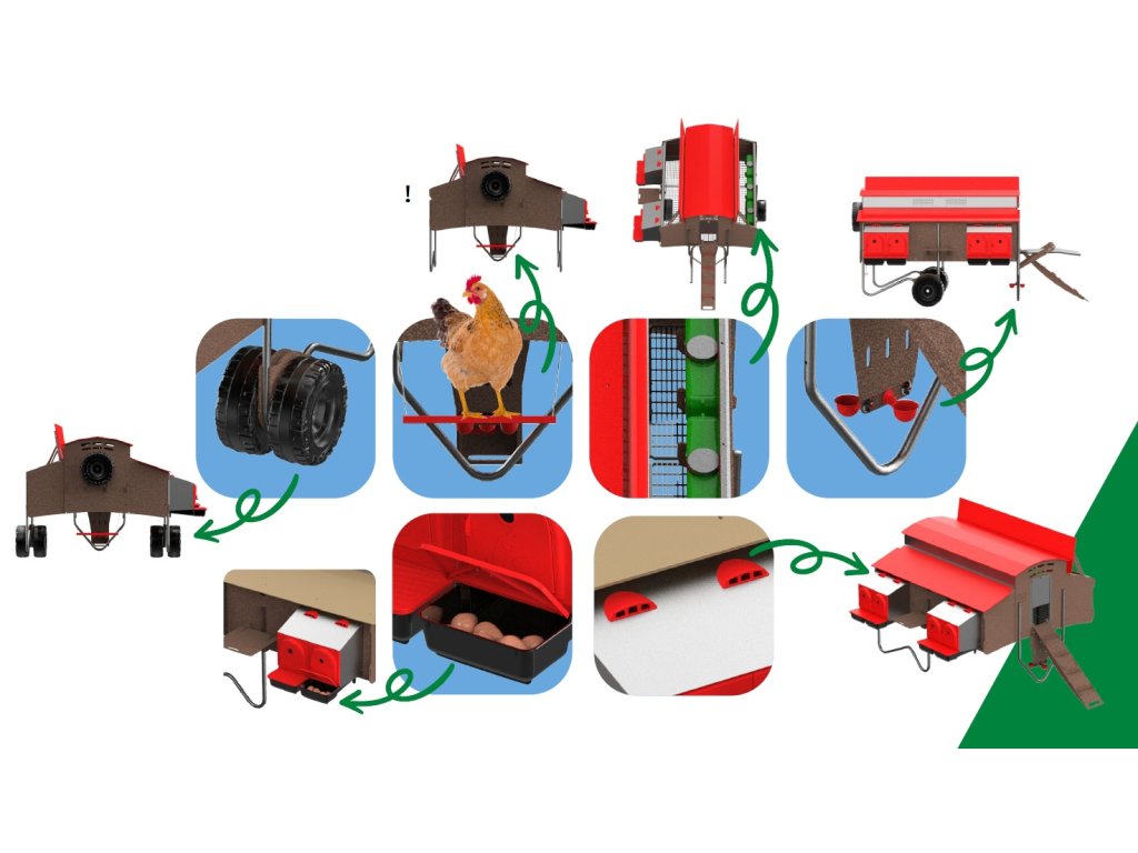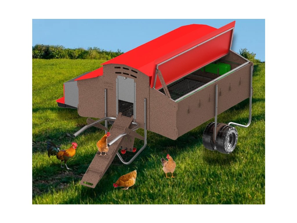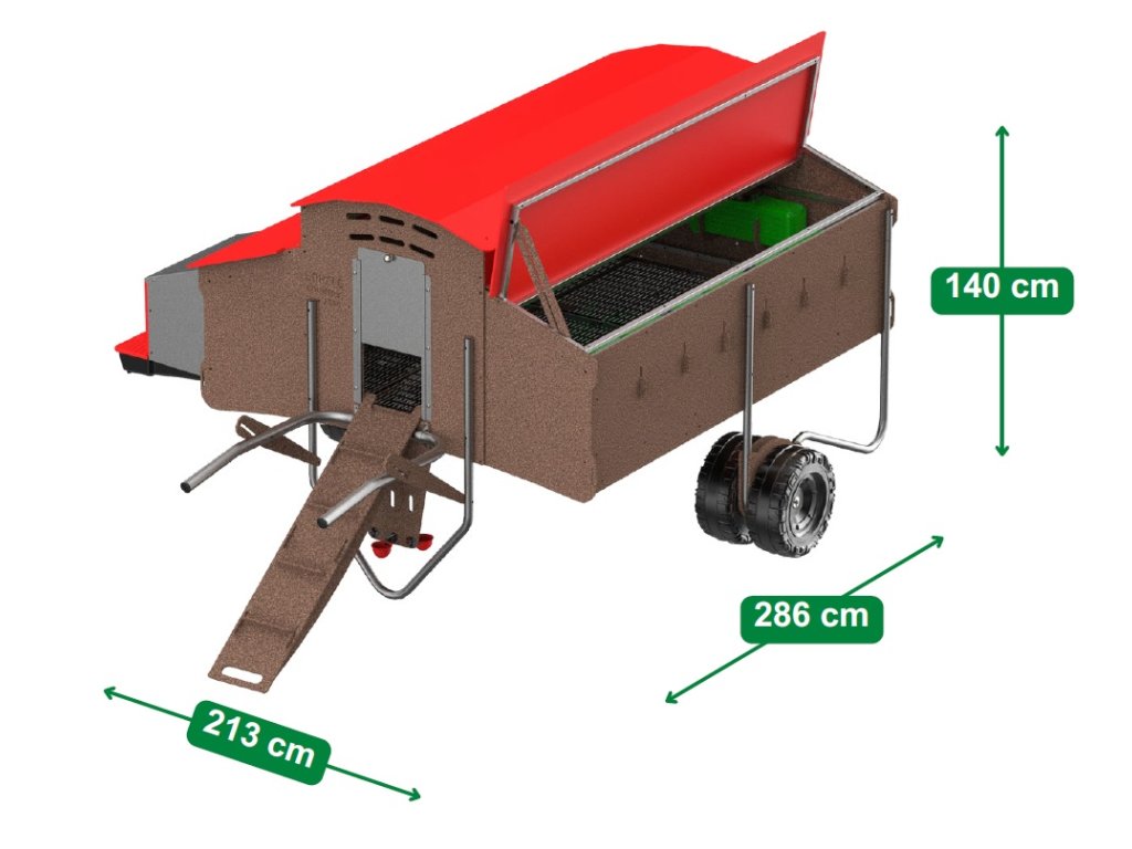 Mobilní kurník pro 25 až 35 slepic - podle velikosti plemene. Součástí jsou napáječky s 35litrovou kapacitou a 4 snášková hnízda se snadným sběrem vajec. Vnitřní prostor pro slepičky má rozměry 150x180 cm.