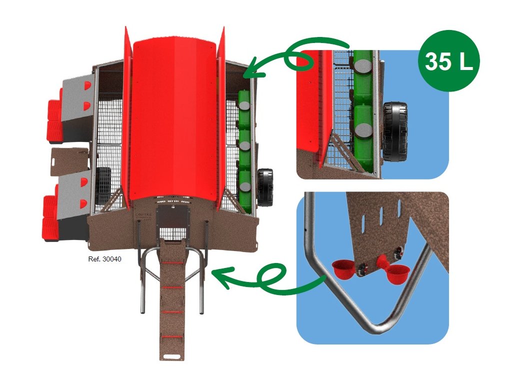 Uvnitř kurníku jsou nádržky na vodu se 4 napáječkami objem napáječek je 35 litrů.