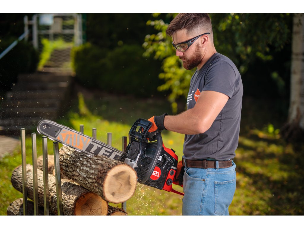 Vzduchem chlazený dvoutaktní motor o zdvihovém objemu 45,8 cm³ a výkonu 1,8 kW si poradí dokonce i s nepoddajným dřevem: Větve, hranoly a palivové dříví proti benzínové řetězové pile nic nezmůžou.
