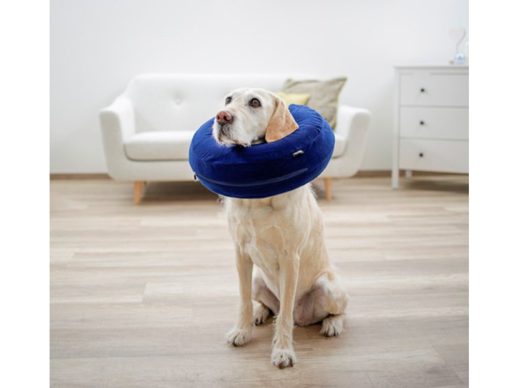 Nafukovací ochranný límec pro psy, chrání rány na hrudi, břiše či zádech, umožňuje krmení a hraní bez omezení, přizpůsobí se tvaru krku, velmi jednoduché nasazení, obvod krku 25-35 cm.