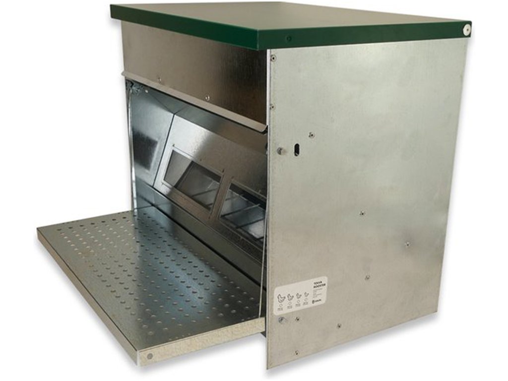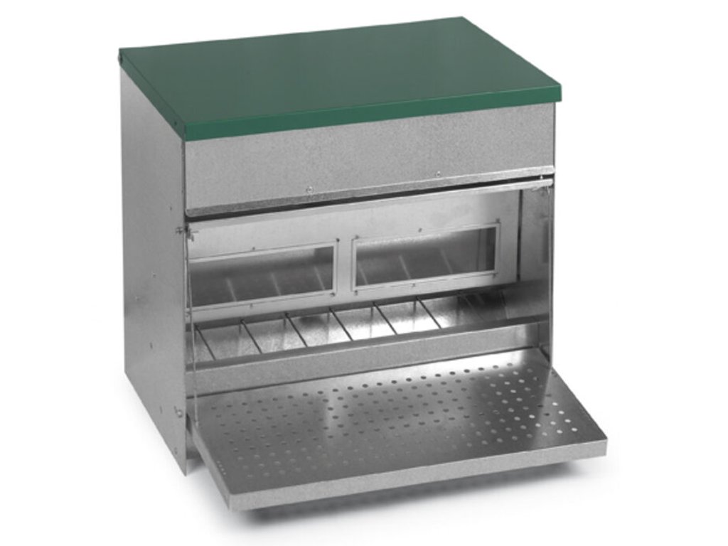 Nášlapné krmítko pro slepice, drůbež, 20 kg krmiva, do 50 slepic, automatické, odolné, snadno omyvatelný pozinkovaný povrch. Pokud hledáte kvalitní automatické jednostranné nášlapné krmítko, pak nemůžete vybrat lépe. Drůbež bude mít po celý den dostatečný přístup k čistému a čerstvému krmivu a Vaším úkolem přitom bude pouze nasypání krmiva do zásobníku. Víko zásobníku má madlo pro snadnější otevření tohoto samokrmítka. Když si slepice stoupne na nášlapnou plošinu, mechanismus otevře víko a zpřístupní jí krmení. Po seskočení z plošiny se krmítko opět uzavře. Nášlapné krmítko pro slepice je vyrobeno ze silného pozinkovaného plechu, a proto bude jeho čištění a údržba opravdu snadná. Rozměry: 450 x 470 x 420 mm.