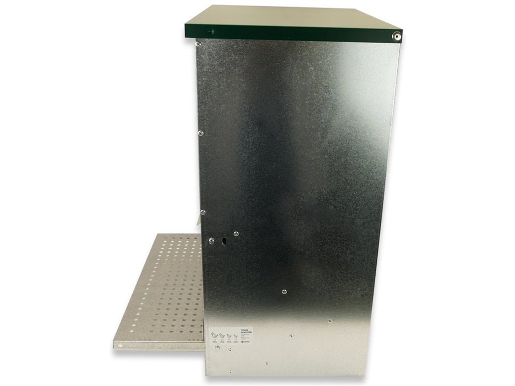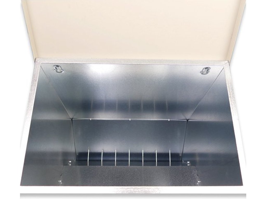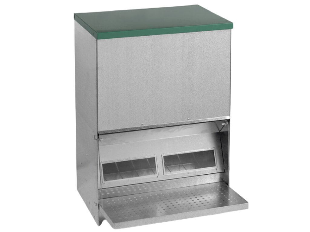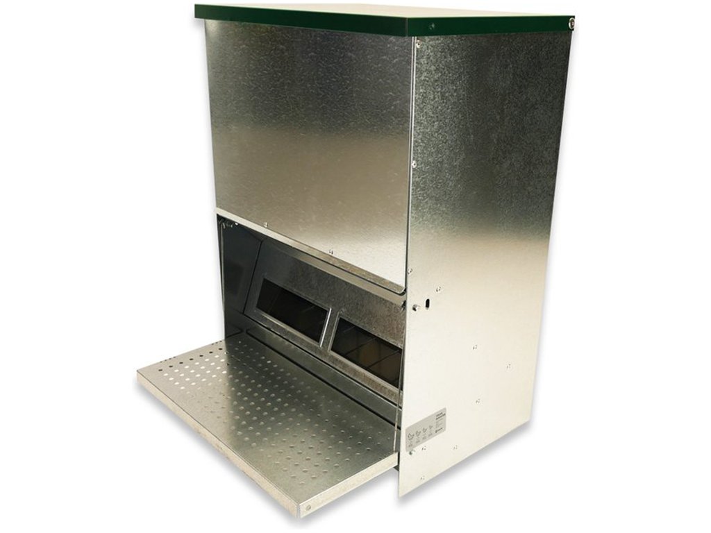 Nášlapné krmítko pro slepice, drůbež, 40 kg krmiva, do 100 slepic, automatické, odolné, snadno omyvatelný pozinkovaný povrch. Pokud hledáte kvalitní automatické jednostranné nášlapné krmítko, pak nemůžete vybrat lépe. Drůbež bude mít po celý den dostatečný přístup k čistému a čerstvému krmivu a Vaším úkolem přitom bude pouze nasypání krmiva do zásobníku. Víko zásobníku má madlo pro snadnější otevření tohoto samokrmítka. Když si slepice stoupne na nášlapnou plošinu, mechanismus otevře víko a zpřístupní jí krmení. Po seskočení z plošiny se krmítko opět uzavře. Nášlapné krmítko pro slepice je vyrobeno ze silného pozinkovaného plechu, a proto bude jeho čištění a údržba opravdu snadná. Rozměry: 450 x 470 x 635 mm.