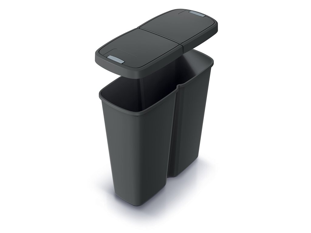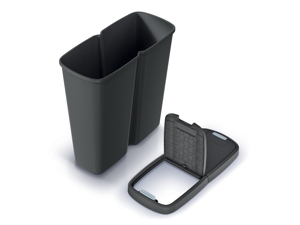 Odpadkový koš o objemu 50 l, jedna velká vnitřní nádoba, dvojité víko s tlačítkovým otevíráním, možnost uchycení 2 odpadkových pytlů pro snadné třídění.