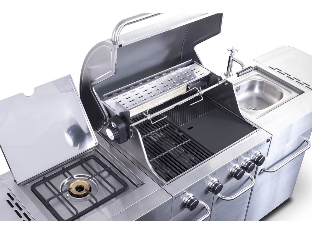 - součástí kuchyně je vestavěný dřez, teploměr ve víku a grilovací jehla