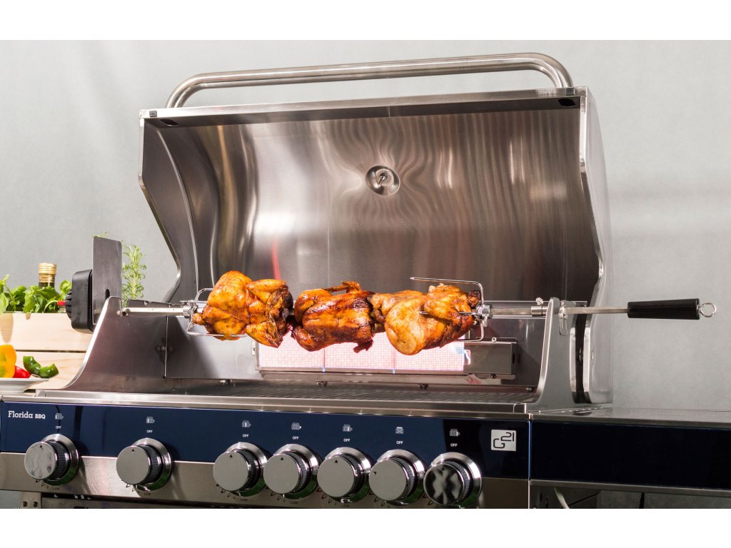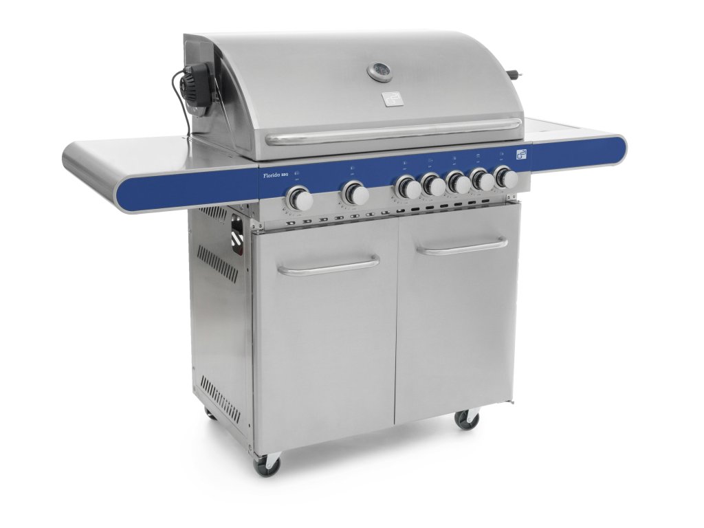 Pojízdný plynový gril G21 Florida BBQ s vestavěným teploměrem ve víku, ze všech stran uzavřenou skříňkou s dvířky na grilovací potřeby a velkou pracovní/odkládací plochou je dokonalým grilem pro každou zahradní grilovačku. Moderní atraktivní design a kvalitní materiál mu zaručují velkou oblibu mezi jeho uživateli.