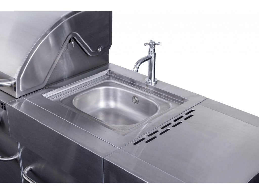 Vše na jednom místě – můžete zároveň grilovat, na bočním hořáku dusit přílohovou zeleninu a použité nádobí hned oplachovat ve vestavném dřezu, bez nutnosti přenášet grilovací vybavení neustále do domu a zpět.