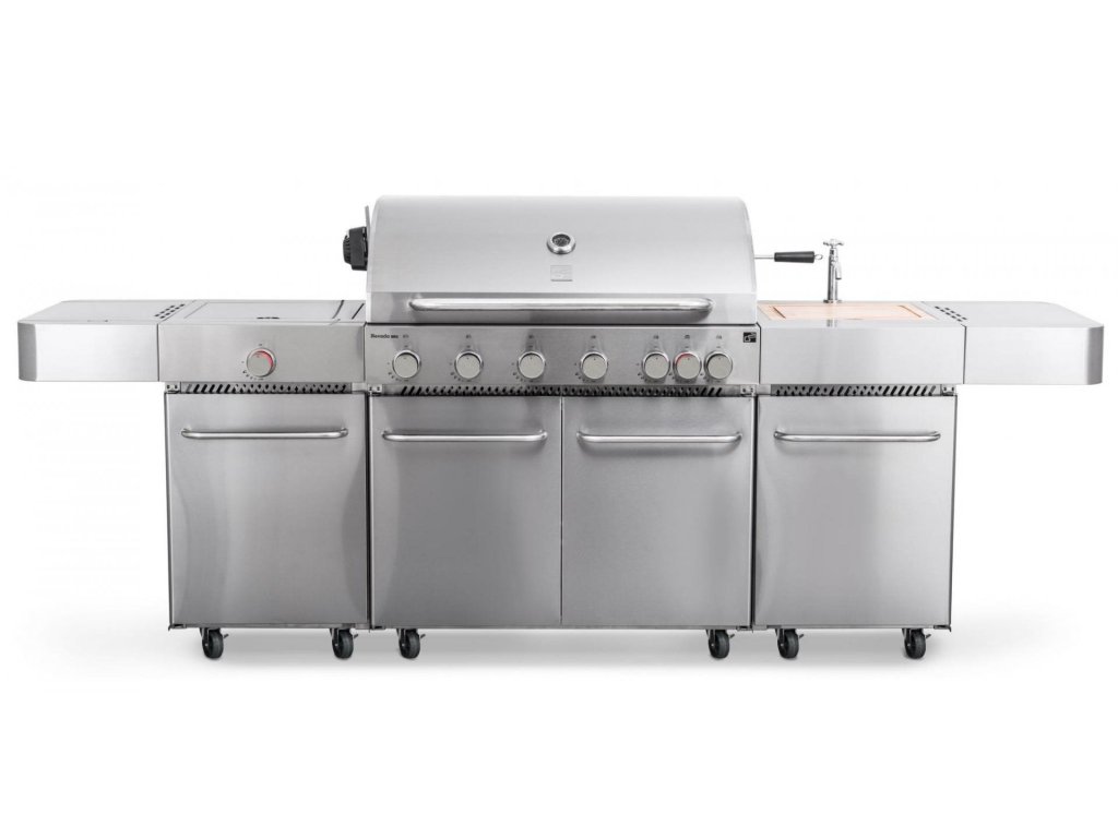 Plynový gril s 6 základními hořáky, 1 bočním + 1 Infra Red hořákem. Grilovací kuchyně Nevada8 hořáků, vestavěný dřez s víkem/krájecím prkénkem a velkou pracovní plochu, chytře řešené odkládací prostory, vestavěný teploměr ve víku, systém Flame Tamer a prodlouženou záruku.