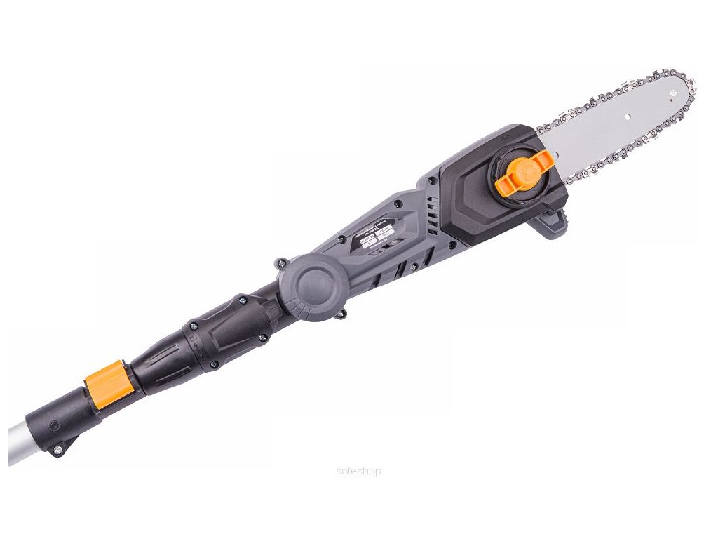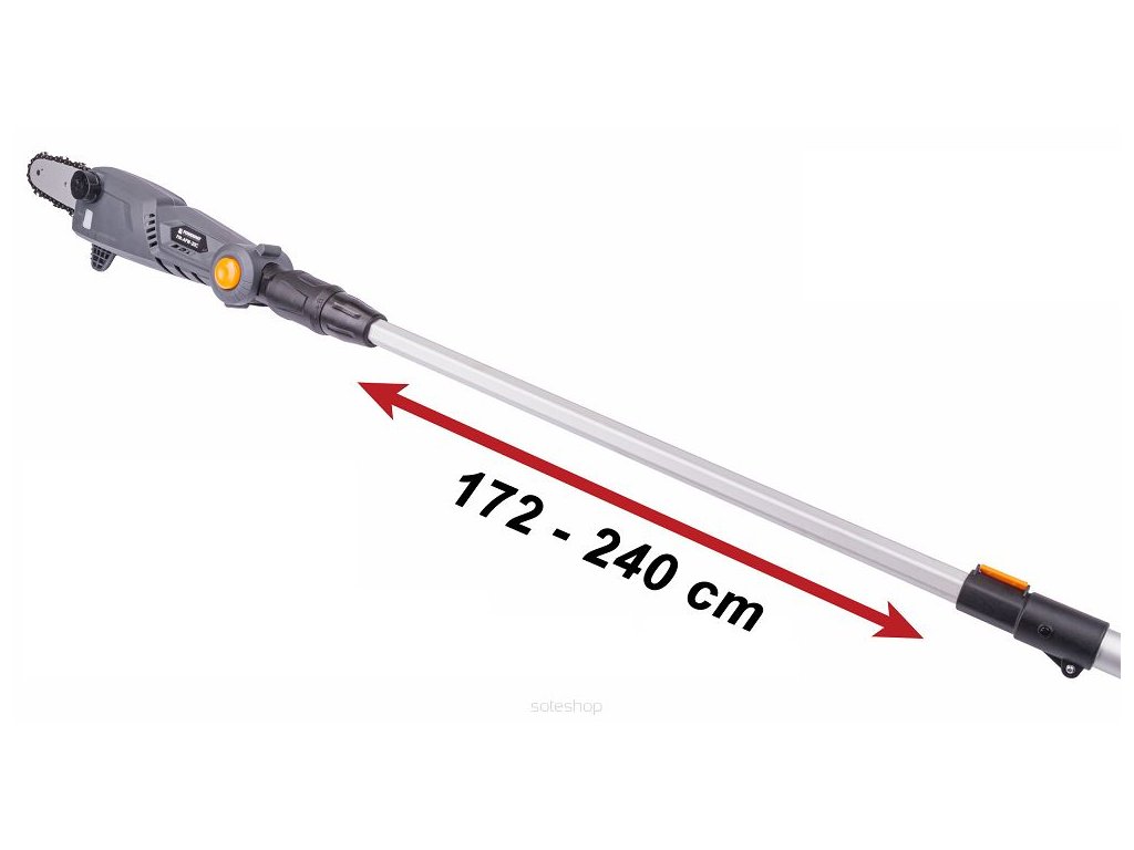 - Díky možnosti rychlého a snadného nastavení délky výložníku od 172 cm do 240 cm a možnosti nastavení úhlu sklonu řezací hlavy ve čtyřech krocích je prořezávání stromů velmi snadné. Elektromotor pro baterii 20 V - 2 Ah umožňuje díky rezervě chodu řezat silné větve.
