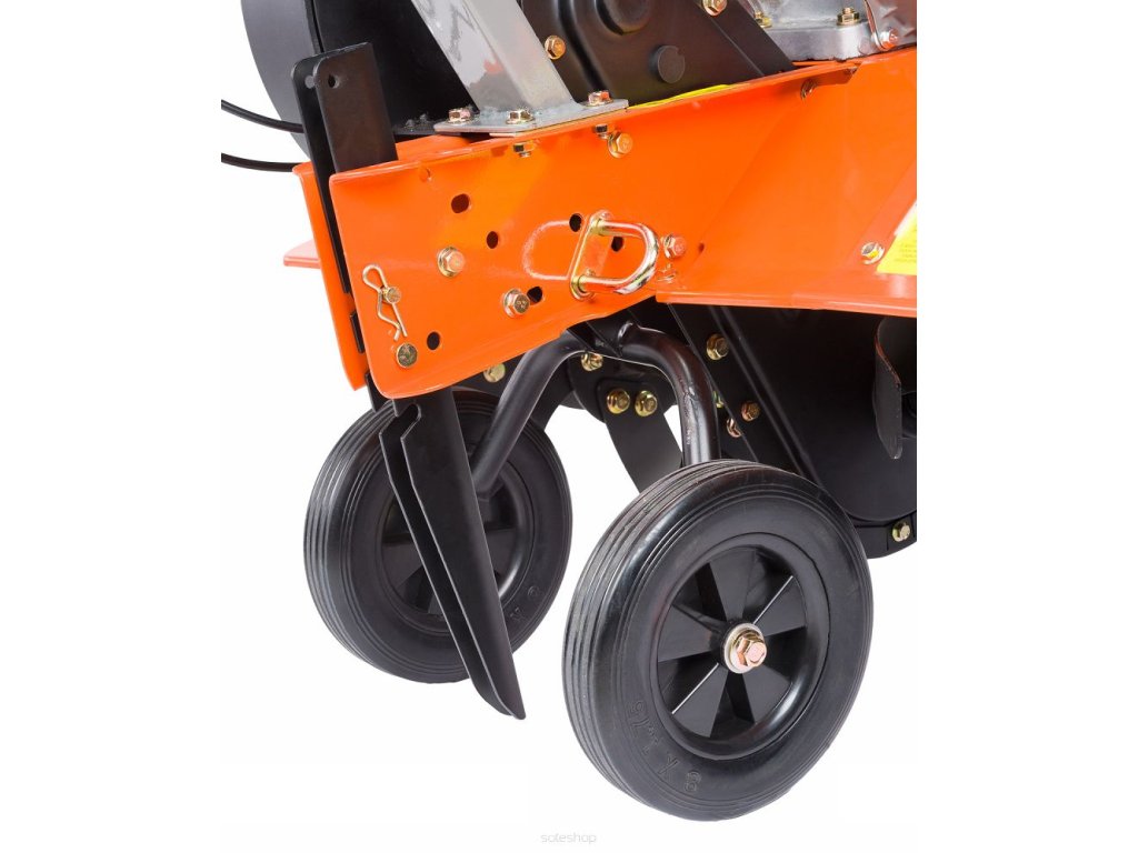 - Kultivátor má transportní kolečka pro snadný pohyb a nastavitelnou výšku ovládací páky a pracovní hloubku. Silniční kola lze nastavit ve 3 úrovních.