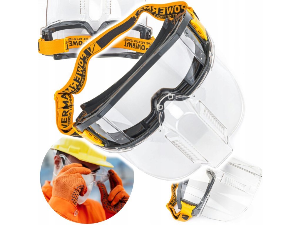Ochranné brýle s vestavěnou maskou POWERMAT PM-GO-OG4 poskytují vysokou úroveň ochrany očí a obličeje proti mechanickým částicím, prachu, chemikáliím a postříkání. Jsou ideální pro stavební práce, řezání, broušení, vrtání a práci s chemickými látkami.
