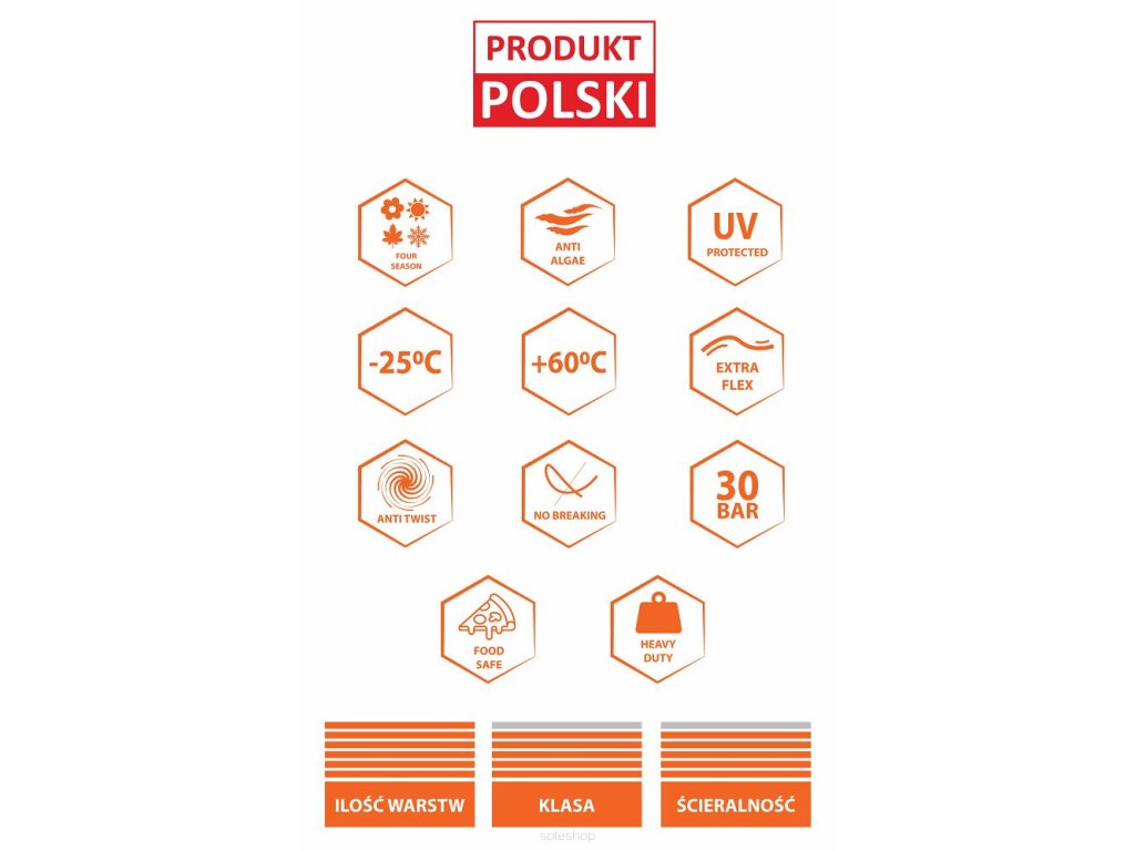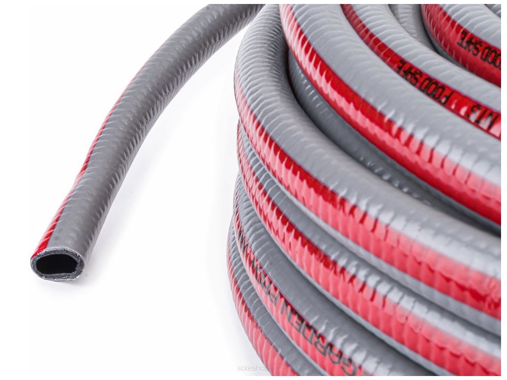 Hadice je vyrobena z velmi kvalitního vnějšího PVC materiálu odolného UV záření, křížového opletení ze syntetických vláken, vnější pružné PVC vrstvy a vrstvy, která umožňuje kontakt s potravinami