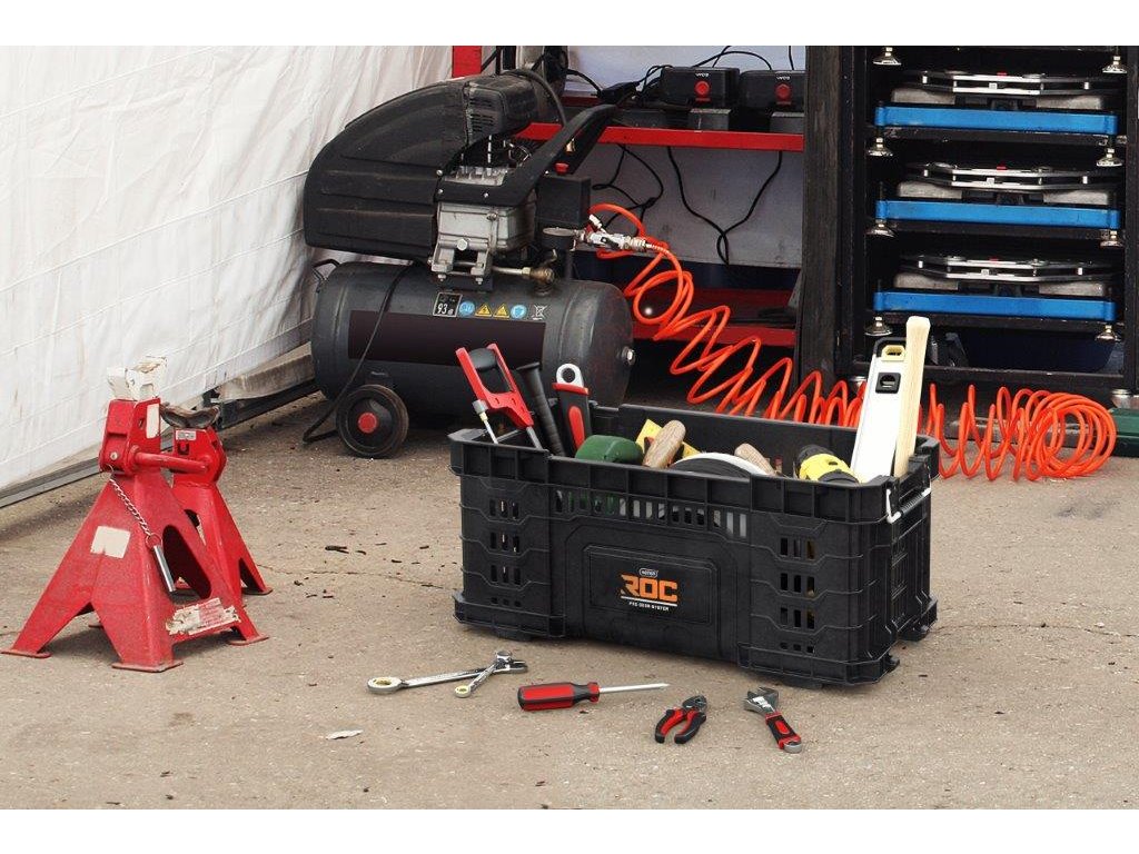 Přepravka, boční kovové rukojeti pro snadnou manipulaci, otevřená horní část pro okamžitý přístup k nářadí, modulární a stohovatelný systém, kompatibilní s řadami ROC Pro Gear 1.0 a 2.0.