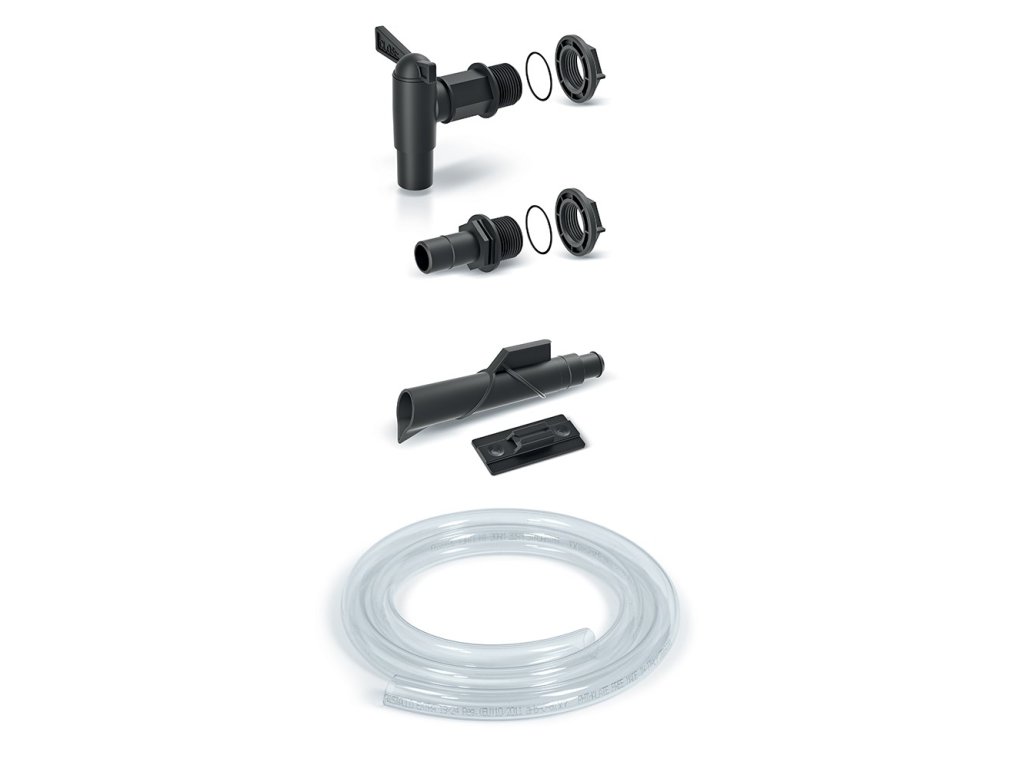 Kvalitní příslušenství pro sud na dešťovou vodu, 5 dílů v balení. Hmotnost 334 g, rozměry 30 x 4 x 37 cm, plast a guma, černá barva a průhledná hadice.