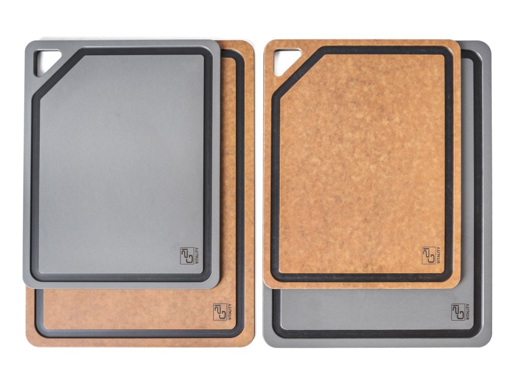 Univerzální prkénka EcoCut z biologicky rozložitelné celulózy spojují odolnost, šetrnost k ostří a moderní design. Snadno odolají i horkým hrncům, takže je můžete použít i jako podložku pod horké nádobí. Díky protiskluzové úpravě se prkénka při práci ani nehnou, zůstávají vždy pevně na místě. Praktická drážka po obvodu zachytí šťávy z masa i jiné tekutiny, díky tomu zůstane kuchyňská linka po krájení bez poskvrnky. V balení najdete rovnou 2 velikosti prkének (30 × 23,5 cm a 37 × 27,4 cm), které si zamilujete při přípravě masa, zeleniny, ovoce i bylinek.