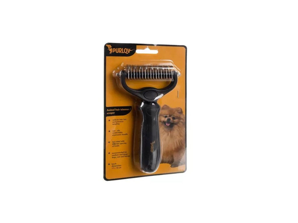 Trimovací hřeben Purlov 20427 je univerzální nástroj pro péči o srst všech typů domácích mazlíčků. Díky dvěma stranám s různou hustotou zubů je vhodný jak pro psy s hustou a bohatou srstí, tak i pro mazlíčky s jemnější podsadou. Pomáhá redukovat vypadávání chlupů, udržuje srst zdravou, lesklou a přirozeně krásnou. Ergonomický tvar rukojeti a zaoblené konce zubů zajišťují pohodlí a bezpečí při každodenním používání.