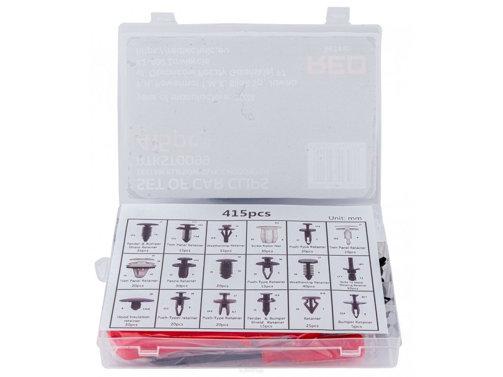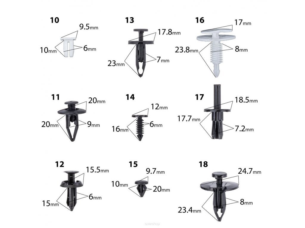 - Univerzálnost: 415 prvků v různých velikostech a tvarech, které se hodí pro většinu modelů aut. Ideální pro upevnění čalounění, lišt, prahů, podběhů, nárazníků, blatníků a dalších prvků.