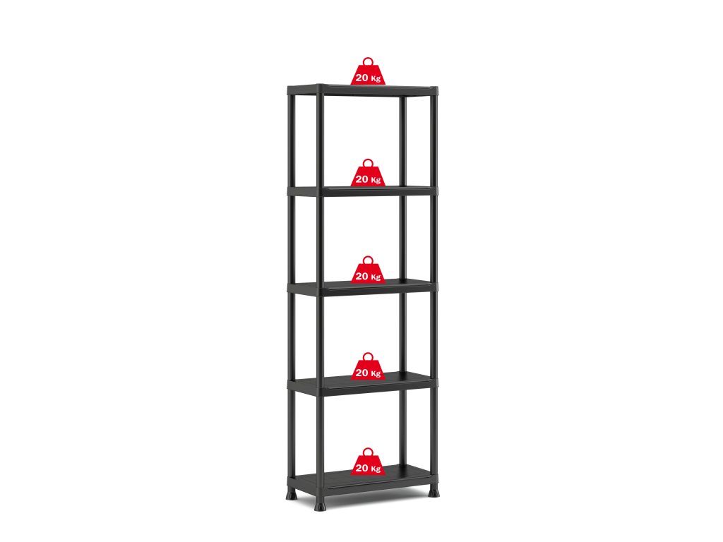 Plastový regál s pěti policemi, nosnost každé police 20 kg. Kompaktní rozměry 60 x 174 x 30 cm, snadná montáž bez nářadí, možnost ukotvení.