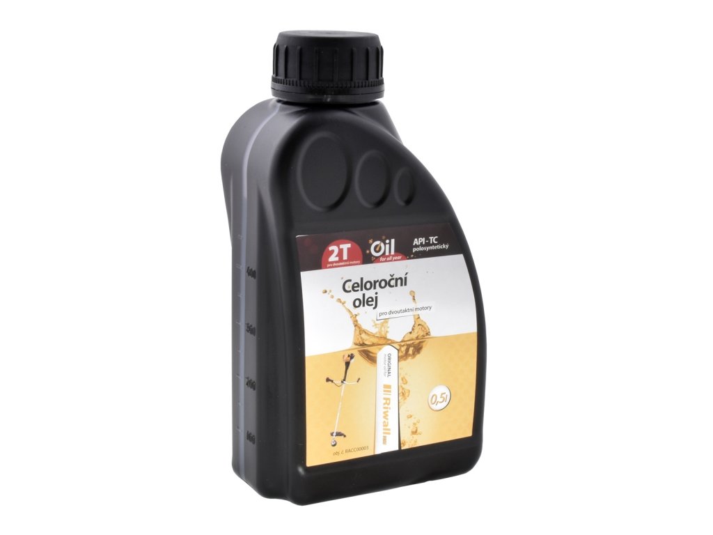 - Kvalitní celoroční motorový olej Riwall pro 2-dobé motory, 0,5 l.