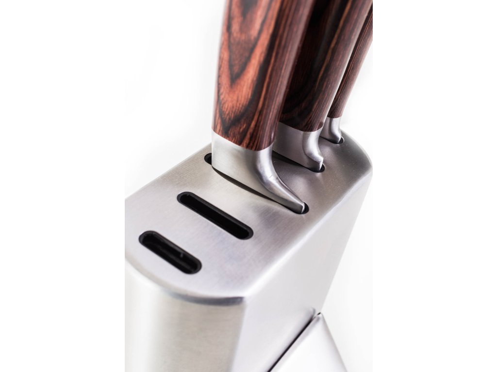 Nevíte kam nože bezpečně uložit? Do stojánku! Součástí sady je designový stojánek ve stříbrném provedení. Ve stojánku má každý z nožů své bezpečné místo.