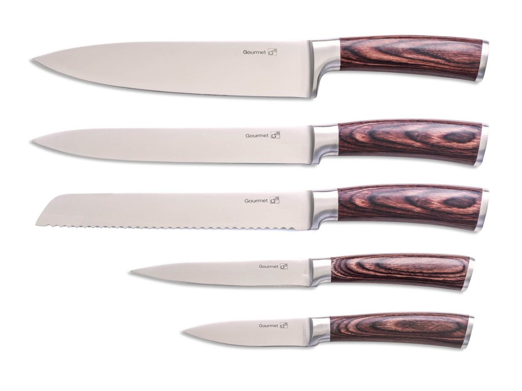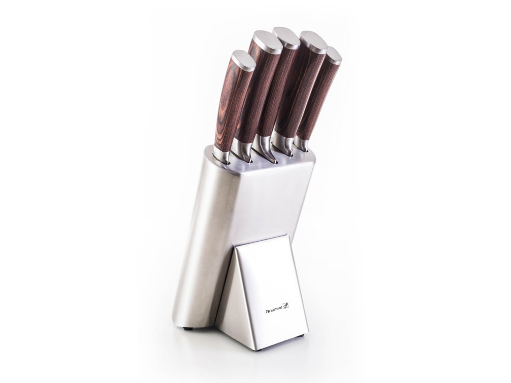 Sada pěti vysoce kvalitních nožů G21 Gourmet Steely s vámi bude krájet, ořezávat i porcovat. Čepele nožů z kvalitní oceli 5CR15, rukojeti z Pakka wood. Nerezový designový stojánek ve stříbrné barvě.