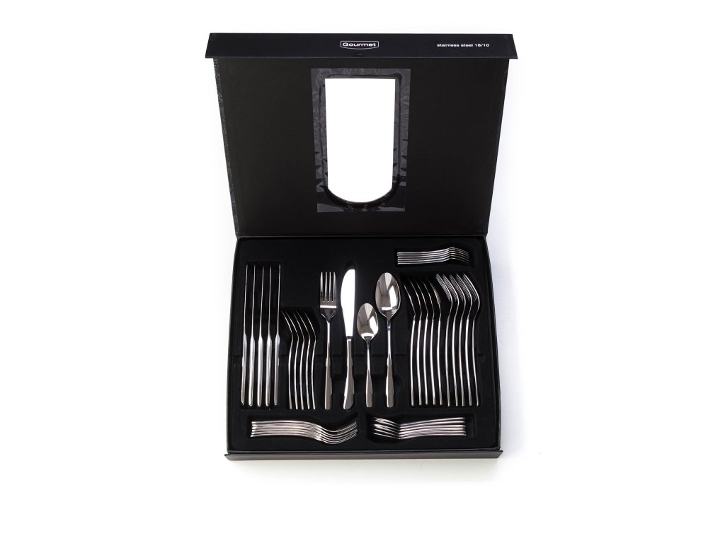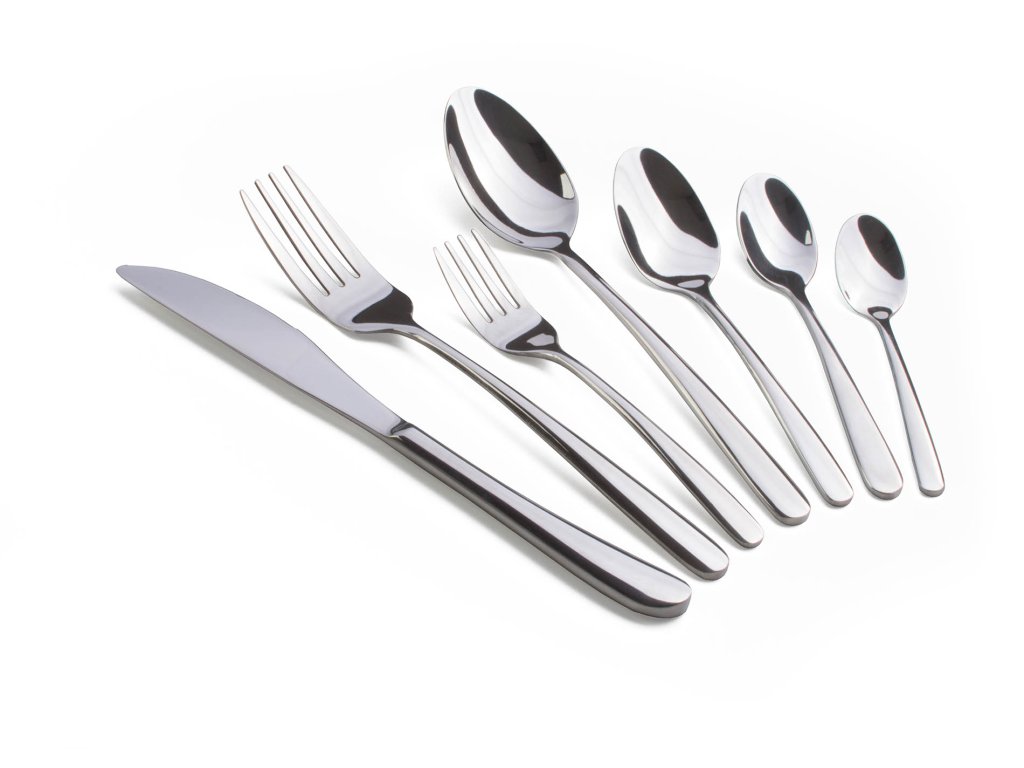 Obsah balení: | 6x jídelní vidlička, 6x jídelní nůž, 6x polévková lžíce, 6x čajová lžička, 6x lžička na presso, 6x dezertní vidlička, 6x lžička na latte |