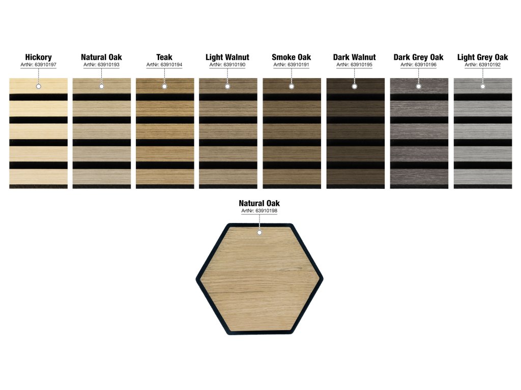 - Barvy vzorků: ořech, kouřový dub, šedý dub, přírodní dub, teak, tmavě šedý dub, tmavý ořech, plástev v barvě přírodní dub