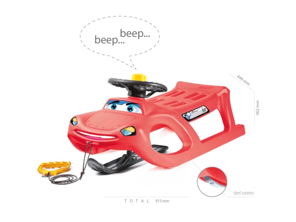 Pomocí volantu děti včas zatočí a vyhnou se překážce na cestě. Pro ještě bezpečnější jízdu mají sáně volant se zvukem. Toho určitě holky a kluci využijí, aby upozornili, že se k vám blíží. Díky ocelovým kluznicím bude jízda hladká a svižná. Jakmile se sklouznou, táhnou za sebou sáně pomocí lana.