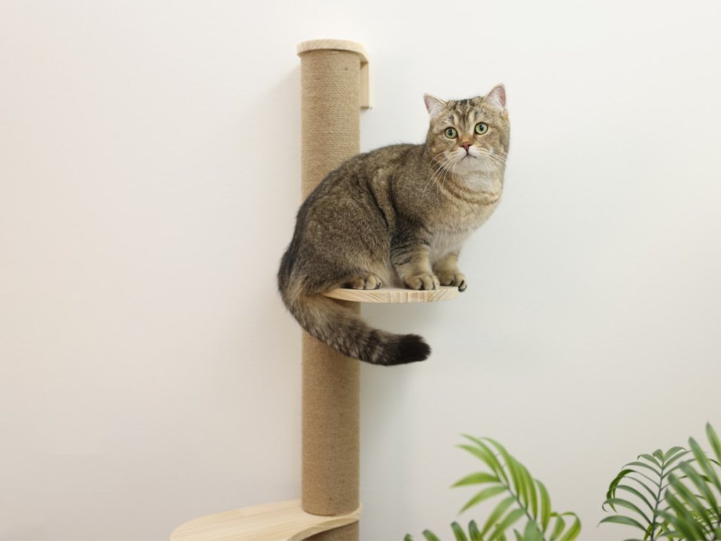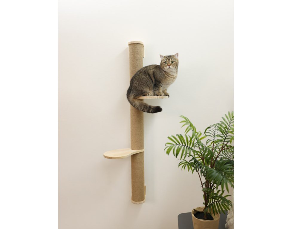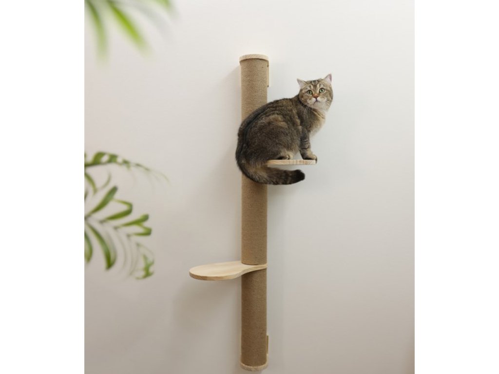 Škrábadlo je vyrobeno z masivního dřeva a nabízí dvě plošiny o rozměrech 24,5 cm x 20 cm, které poskytují kočkám pohodlný prostor pro odpočinek a pozorování okolí. Sloupek o délce 40 cm je potažen přírodním jutovým provazem o průměru 5 mm a lze ho snadno připevnit na zeď.
