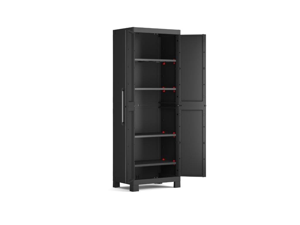 Skříň Keter Detroit High obsahuje celkem 4 přídavné police, které maximálně zpřehlední organizaci vnitřního prostoru. Každá z nich využívá bezpečnostní pojistku SLO pro snadné výškové přizpůsobení a rovněž nabízí maximální nosnost až 15 kg, což přijde vhod pro výrazně těžší předměty všeho druhu. V útrobách skříně tak pohodlně uchováte i rozličné dílenské a zahradní nářadí, které by se jinam nevešlo. Velkou výhodou produktové řady Keter Detroit je také jednotný spojovací systém, díky kterému vytvoříte kompletní skříňovou stěnu pro všestranné využití dle vašich potřeb a preferencí.