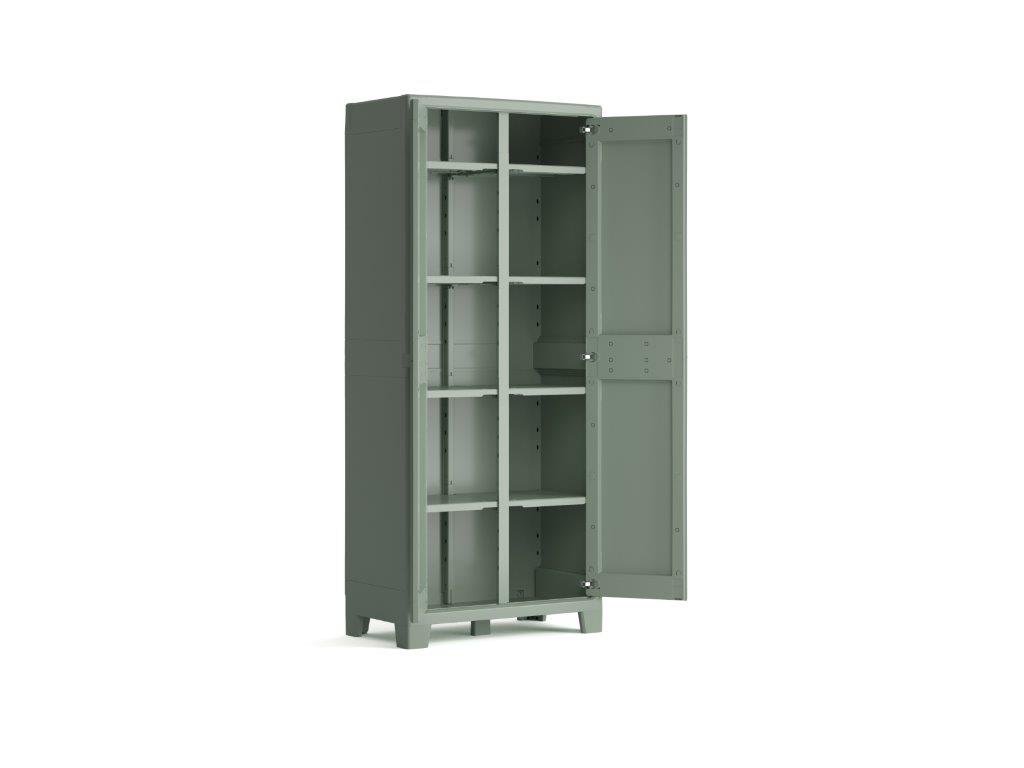 Skříň obsahuje celkem 8 polic s nastavitelnou výškou – každá s nosností až 15 kg. Využijete ji tedy pro skladování dílenského nářadí či zahradnických potřeb. Pokud vyjmete police, uložíte do skříně i náčiní s dlouhou násadou, které by se jinam nevešlo.