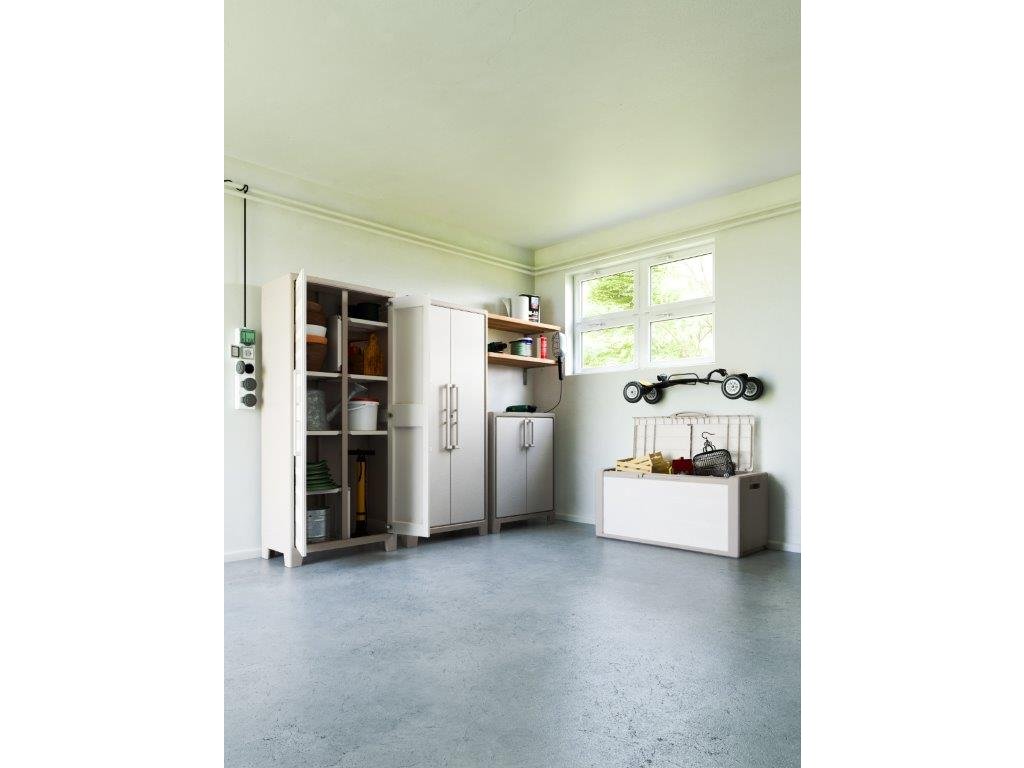 Skříň je vyrobena z odolného plastu, který chrání UV vrstva proti předčasnému stárnutí materiálu. Ochrana IPX3 zajistí bezpečné použití i ve vlhčím prostředí. Dveře jsou vybaveny systémem Assisted Opening System (AOS), který podporuje snadné a pevné zavírání. Stabilitu zajišťuje pátá noha a možnost uzamknutí skříně dodává na bezpečnosti.