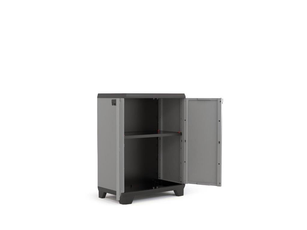 Menší úložná skříň pro multifunkční využití v garážích, dílnách nebo na verandách, snadná a rychlá montáž. 1 police s variabilním umístěním, nosnost 15 kg. Možnost uzamčení visacím zámkem, kvalitní plast. Šedá barva.