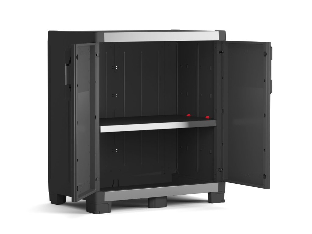 - 1x skříň Keter XL Garage Low s policemi, nožičkami a uzamykatelnými dveřmi