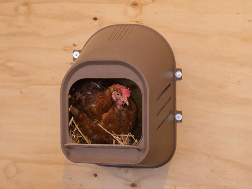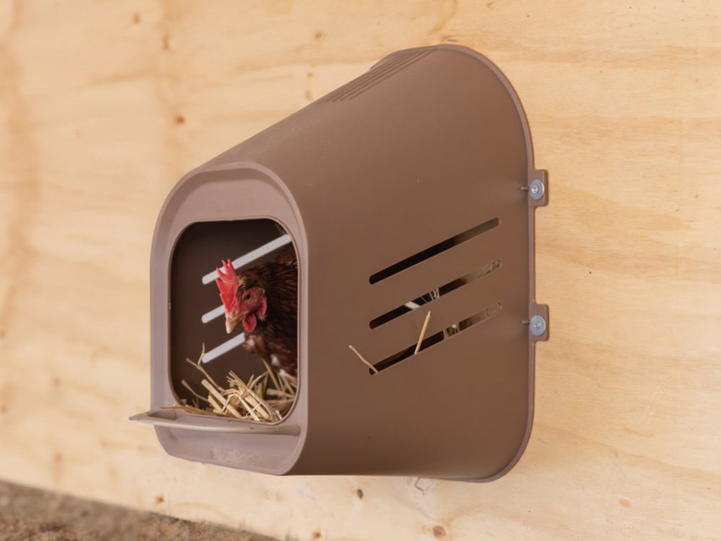Snáškové hnízdo pro slepice, kapacita až pro 5 nosnic na jednu kukaň, vyrobené z plastu, barva hnědá. Jednoduché připevnění na zeď, velmi snadná údržba čistoty, rozměry 40cm výška x 42cm šířka x 51cm délka.