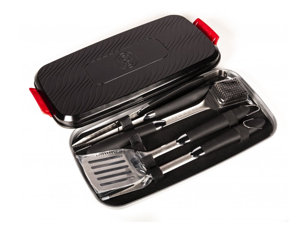 Tato 5 dílná nerezová grilovací sada v přenosném plastovém boxu bude praktickým příslušenstvím pro grilovačku.