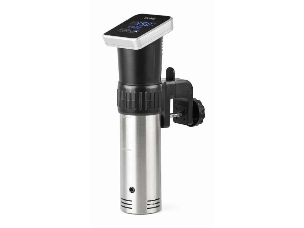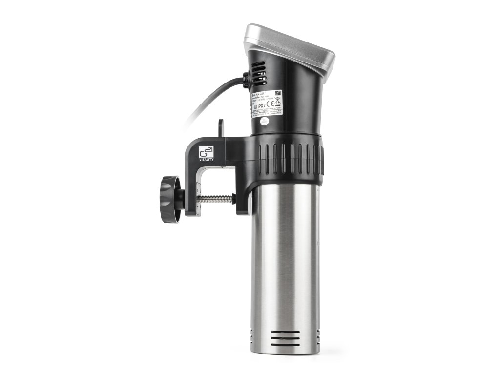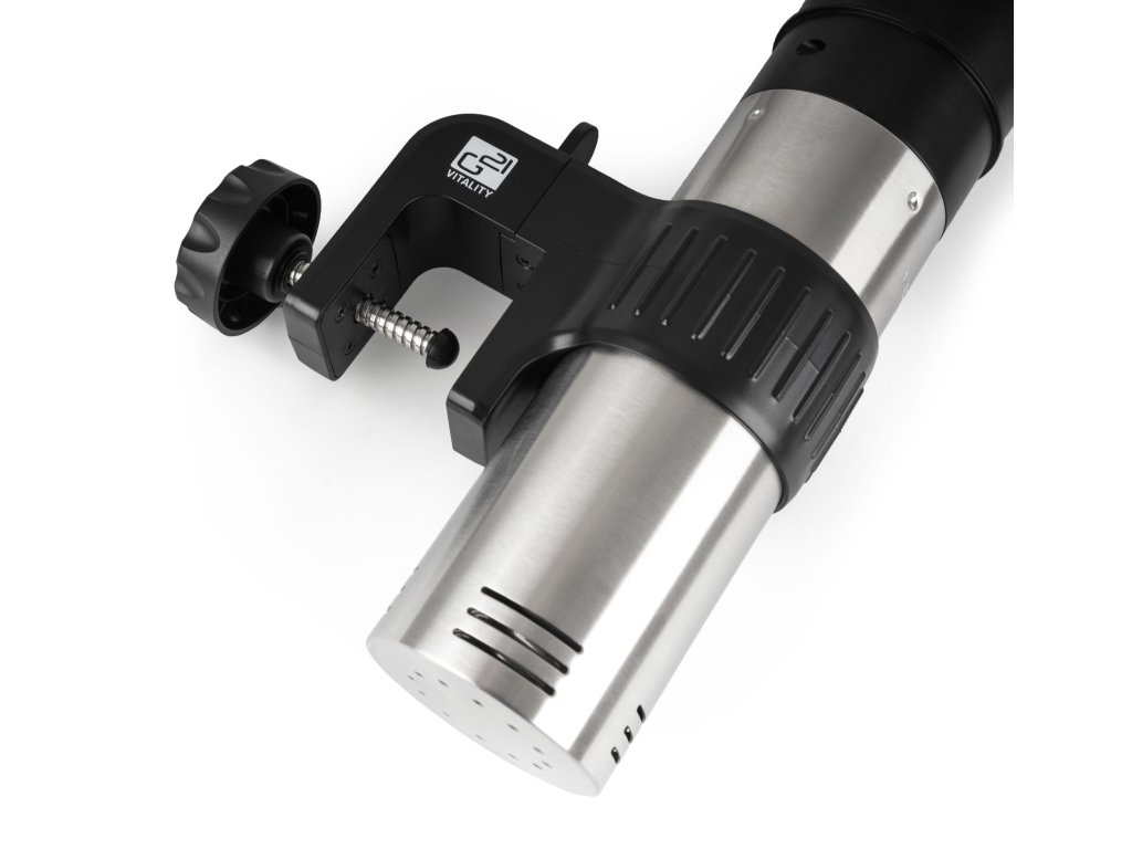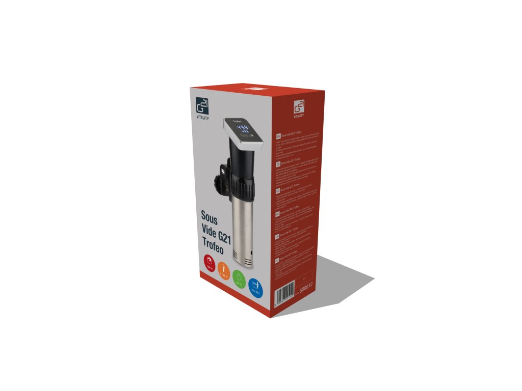 Ponorný pomalý vařič G21 Trofeo s příkonem 1 200 W je skutečným mistrem v sous-vide vaření ve vakuu. Je připraven pro každodenní bezpečné použití a vyladěný do nejmenších detailů. Elegantní tělo se skládá ze dvou částí – ponorná část s vnitřní varnou spirálou a vrchní část s elektronikou a kulatým dotykovým displejem. Pro bezpečné zavěšení sous-vide vařiče G21 Trofeo na okraj varné nádoby jsme ponorný vařič vybavili posuvným upevňovacím klipsem.