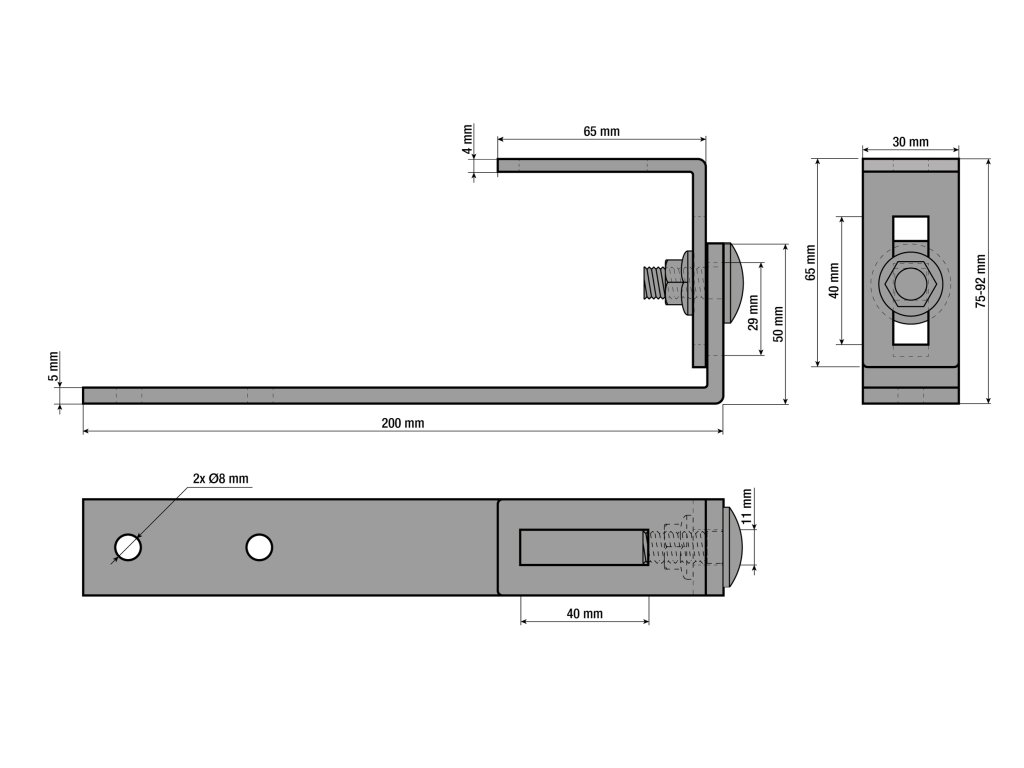Nastavitelný střešní hák pro kotvení montážních profilů na hladké střechy, 2 otvory o průměru 8 mm, rozměry háku 200 x 5 x 30 mm.